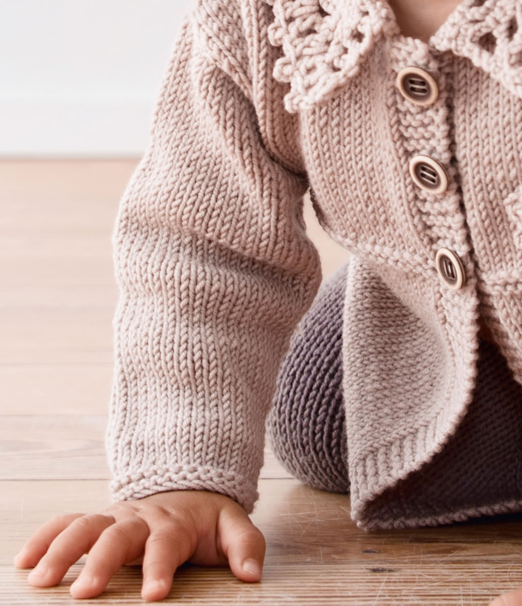 Lana Grossa Qualität „Cool Wool Big“, 100 % Schurwolle, Lauflänge 120 m/50 g; ca. 150 g helles Rosenholz (Fb 953); Stricknadeln Nr. 3,5, eine Häkelnadel Nr. 3; 3 Knöpfe.