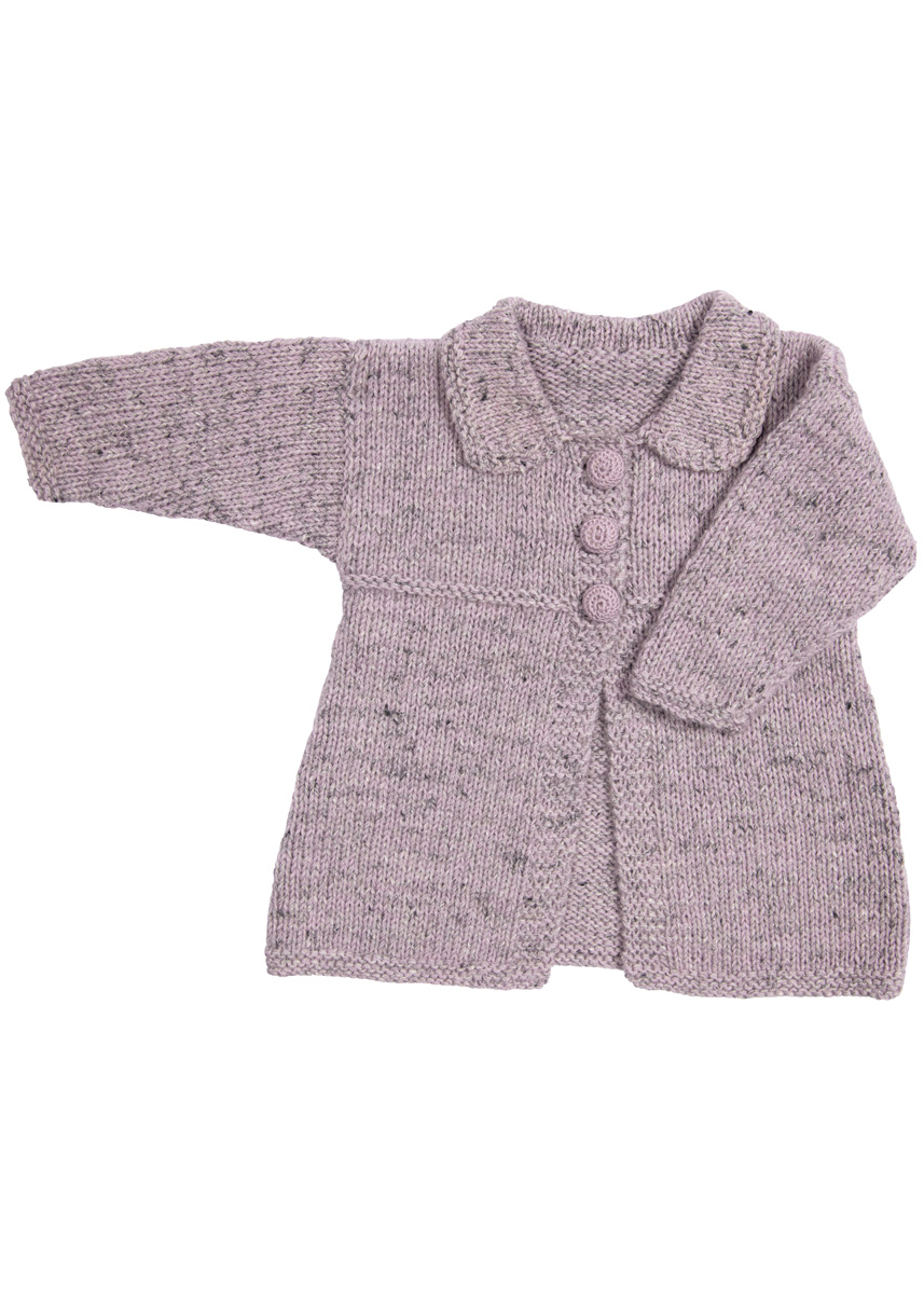 Lana Grossa Ecopuno Tweed (60 % Baumwolle, 16 % Polyester, 14 % Alpaka (Baby), 10 % Schurwolle (Merino), Lauflänge 160 m/50 g) 150 (150/200) g Rosagrau meliert (Fb 308) und Cool Wool Lace (100% Schurwolle (Merino), Lauflänge 400 m/50 g) 50 g Flieder (Fb 15); Stricknadeln Nr. 4,5, eine 40 cm lange Rundstricknadel Nr. 4,5, eine Häkelnadel Nr. 2; drei Knöpfe mit ca. 20 mm Ø.