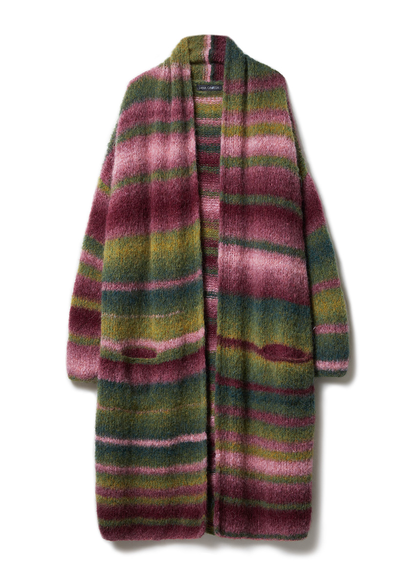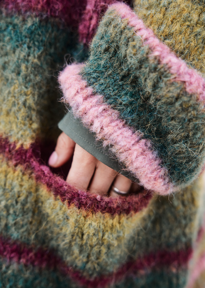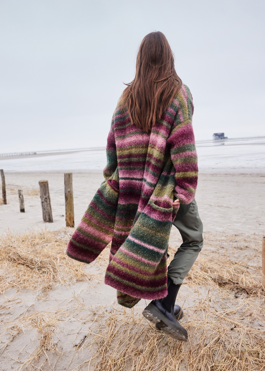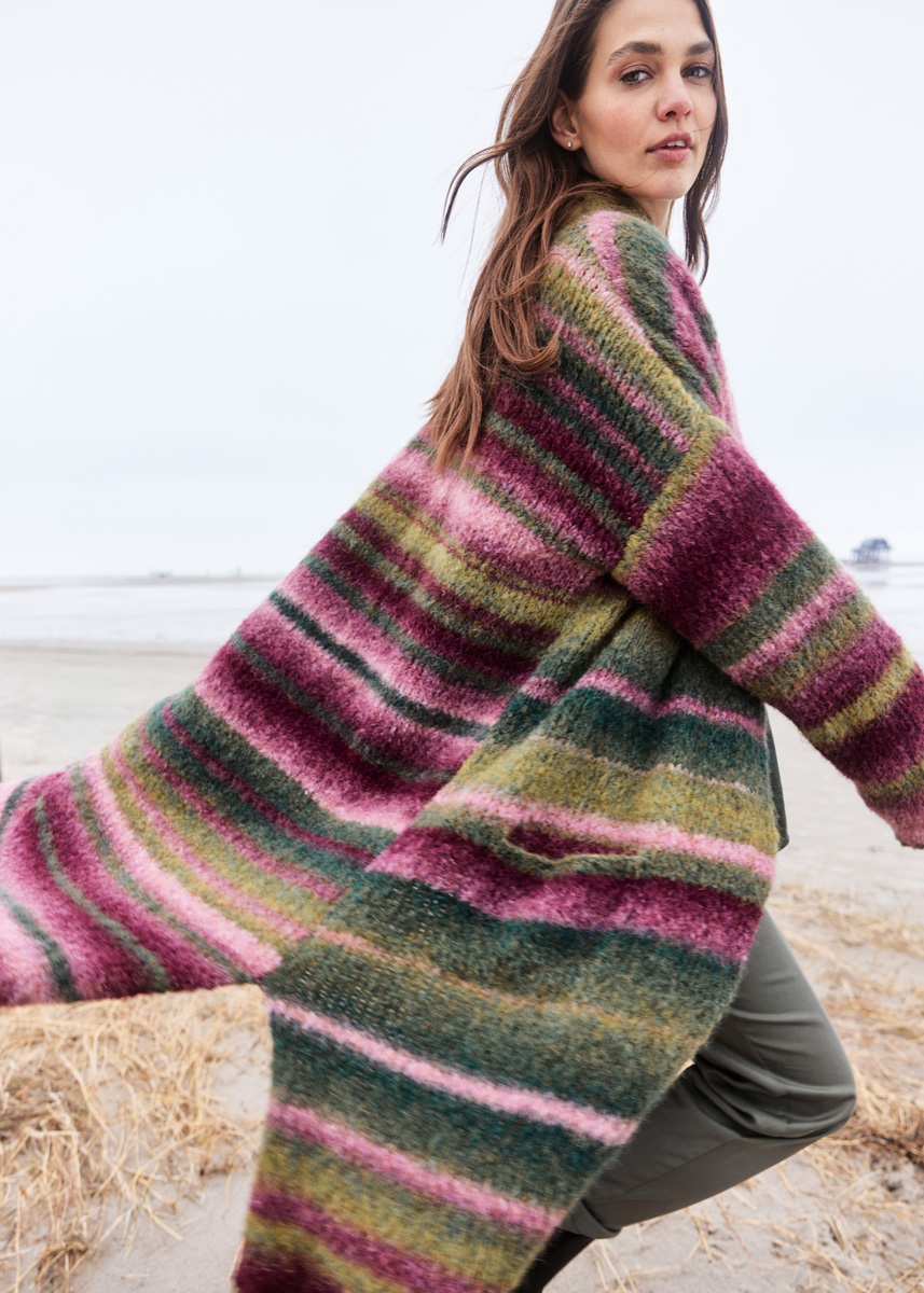 Lana Grossa-Qualität „Gigante“ (70 % Alpaka (fine), 30 % Polyamid, LL = ca 300 m/100 g): ca 500 (500 - 600 - 600 - 700) g Altrosa/Brombeer/Hell-/Dunkeloliv (Fb 10); Stricknadeln Nr 5,5 und Nr 6.