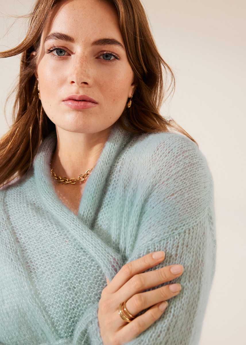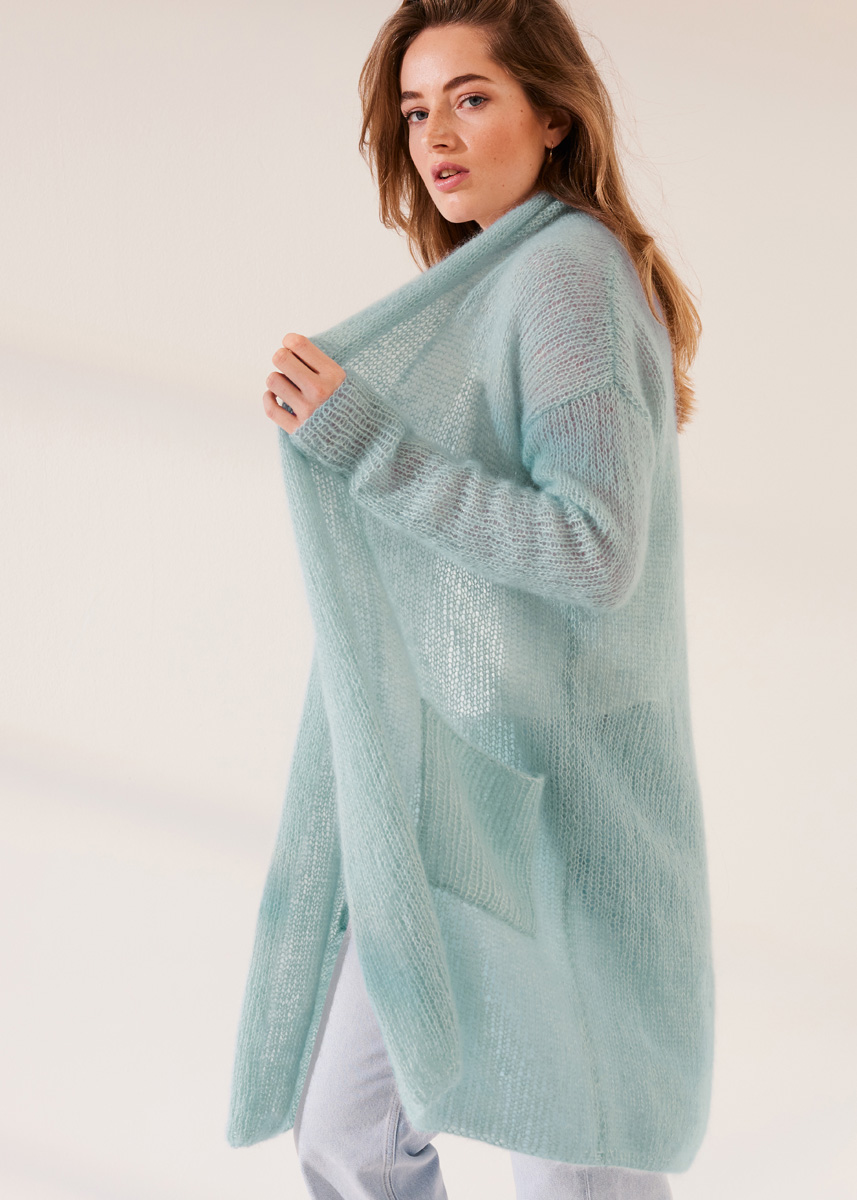 Lana Grossa-Qualität „Silkhair” (70 % Mohair (Superkid), 30 % Seide, LL = ca. 210 m/25 g): ca. 300 (325 - 350) g Mint (Fb. 175); Stricknadeln Nr. 6.