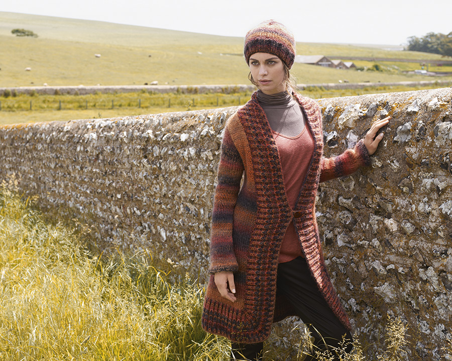 Liz findet, dass dieser farbenfrohe Strickmantel mit der dekorativen breiten Blende einen fröhlichen Seventies-Touch hat und mir gut steht! Finde ich auch.