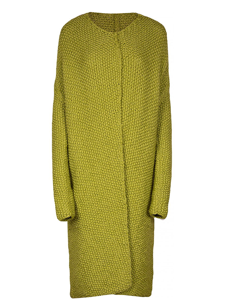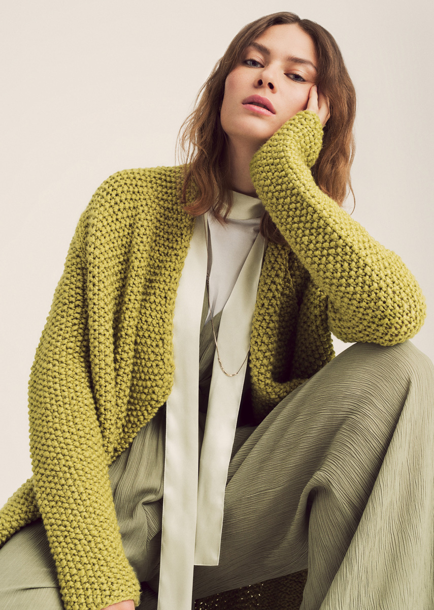 Lana Grossa-Qualität „Lala Berlin Chunky“ (80 % Schurwolle (Merino), 15 % Seide, 5 % Polyamid, Lauflänge 50 m/50 g): ca. 1400 (1450) g Kiwigrün (Fb. 9); Stricknadeln Nr. 8, 1 Rundstricknadel Nr. 8, 60 cm lang.