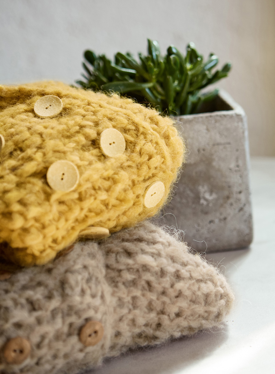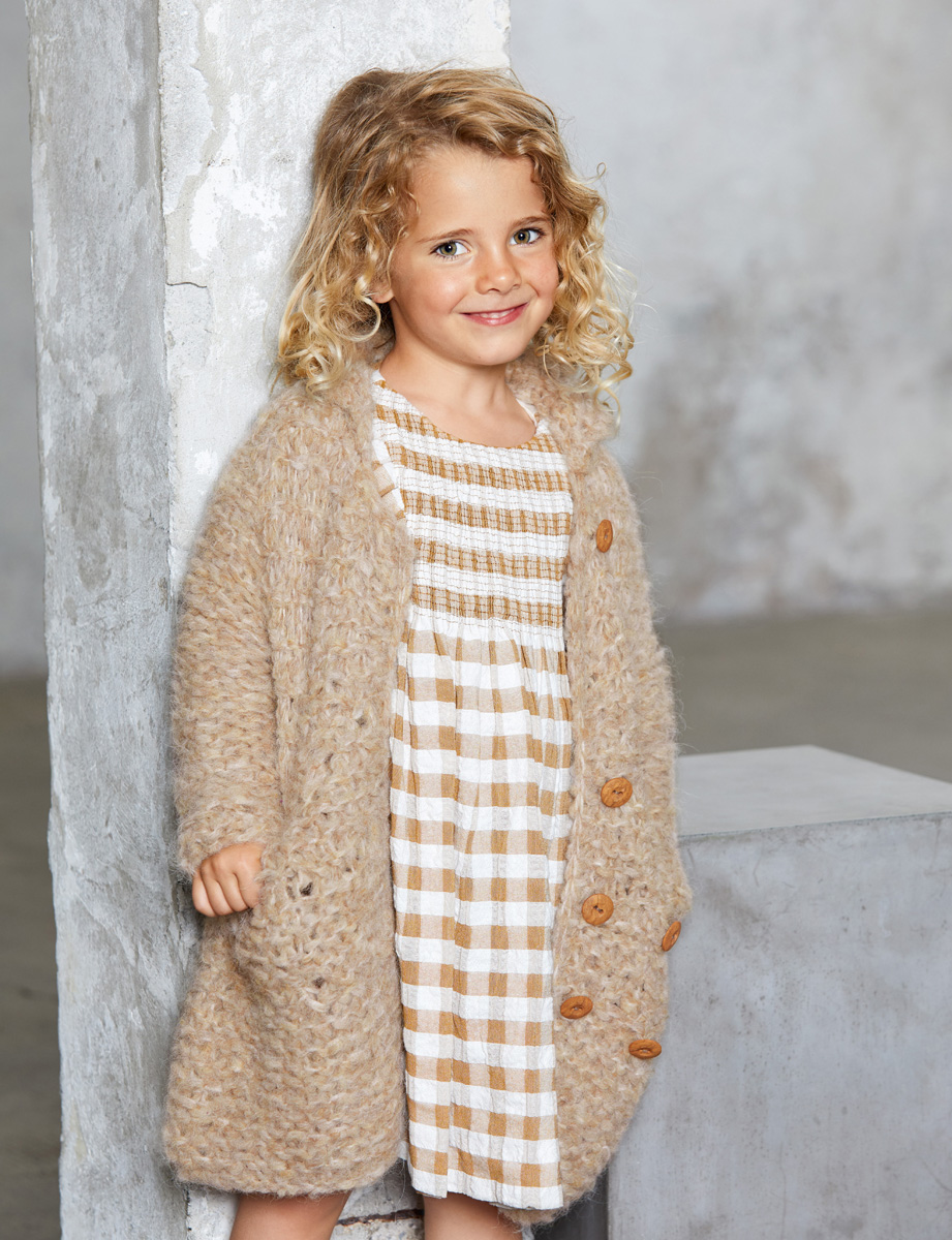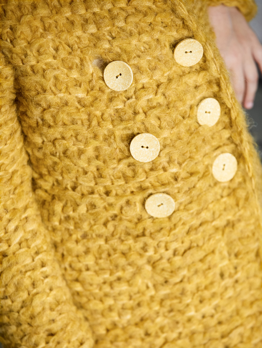 Lana Grossa Lala Berlin Furry (90 % Baby Alpaka, 10 % Polyamid, Lauflänge 75 m/50 g), 200 (250 – 300) g Beige (Fb 2) bzw. Gelb (Fb 3); Stricknadeln Nr. 12, 1 Rundstricknadel Nr. 10 und 12, 40 cm lang, 1 Häkelnadel Nr. 7, 6 oder 7 Knöpfe von UNION KNOPF, beigefarbener Mantel: Art. 453081, Fb 38, Gr. 22 mm, gelber Mantel: Art. 452685, Fb 1, Gr. 28 mm.