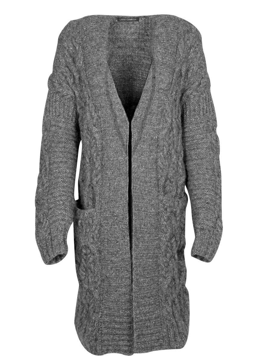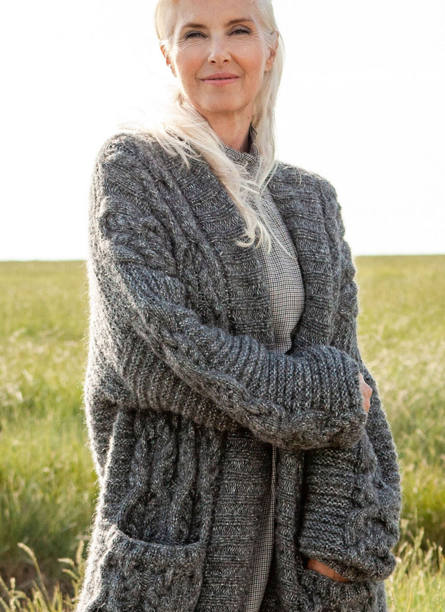 Lana Grossa Lala Berlin Shiny (46 % Baby Alpaka, 30 % Baumwolle, 8 % Schurwolle Merino, 8 % Polyester, 8 % Polyamid, Lauflänge 150 m/50 g), 600 (650 – 700) g Grau (Fb 6); Stricknadeln Nr. 4,5 und 5,5, 1 Rundstricknadel Nr. 4,5, 100 cm lang, 2 Zopfnadeln, 1 Häkelnadel Nr. 4,5.