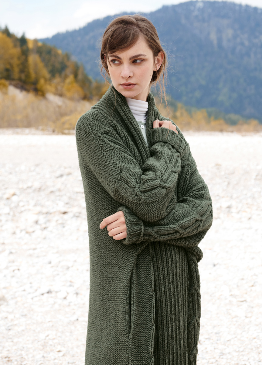 Lana Grossa Landlust Merino 120 (100% Schurwolle Merino superwash, Lauflänge 120 m/50 g), 900 (1000 – 1100) g Graugrün (Fb 135) und Lana Grossa Landlust Merino 180 (100% Schurwolle Merino superwash, Lauflänge 180 m/50 g), 50 g Graugrün (Fb 235); Stricknadeln Nr. 5, 7 und 8, 1 Zopfnadel.