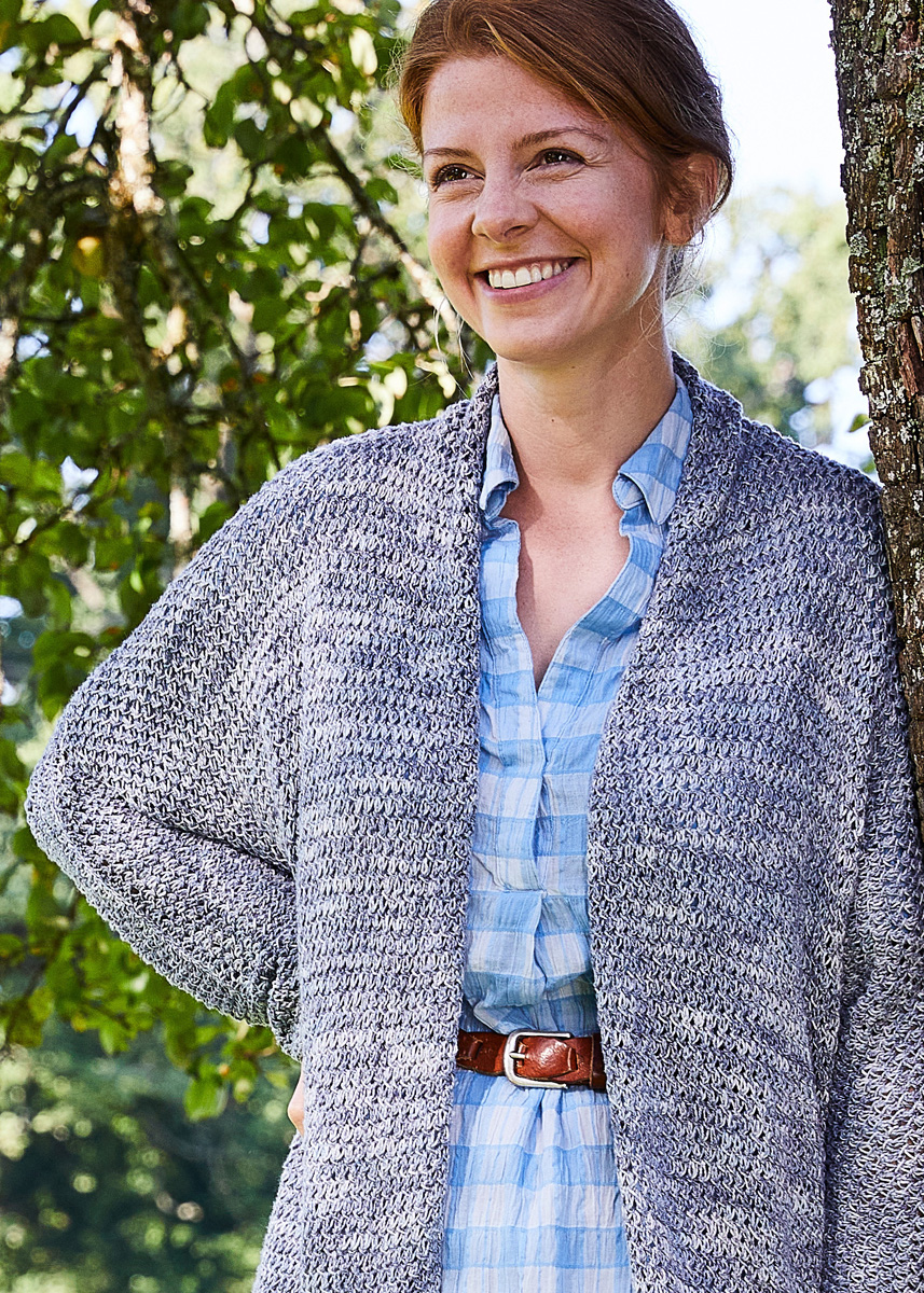 Lana Grossa-Qualität „Landlust-Sommerseide Mélange“ (50% Seide, 50% Baumwolle, LL ca. 170 m/ 50 g), 700 (800) g in Dunkeljeans meliert (Fb 112); 1 Rundstricknadel Nr. 3,5, 100 cm lang.