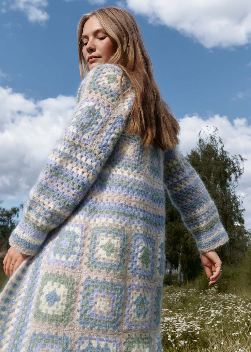 Pudrige Töne und Flauschgarn lassen die Granny Squares dieses Mantels wie weichgezeichnet erscheinen. Imposant: die Länge. Aufgelockert wird das Schmuckstück von gestreiften Partien, die auch die Ränder effektvoll umgarnen. Romantik, delikat buchstabiert