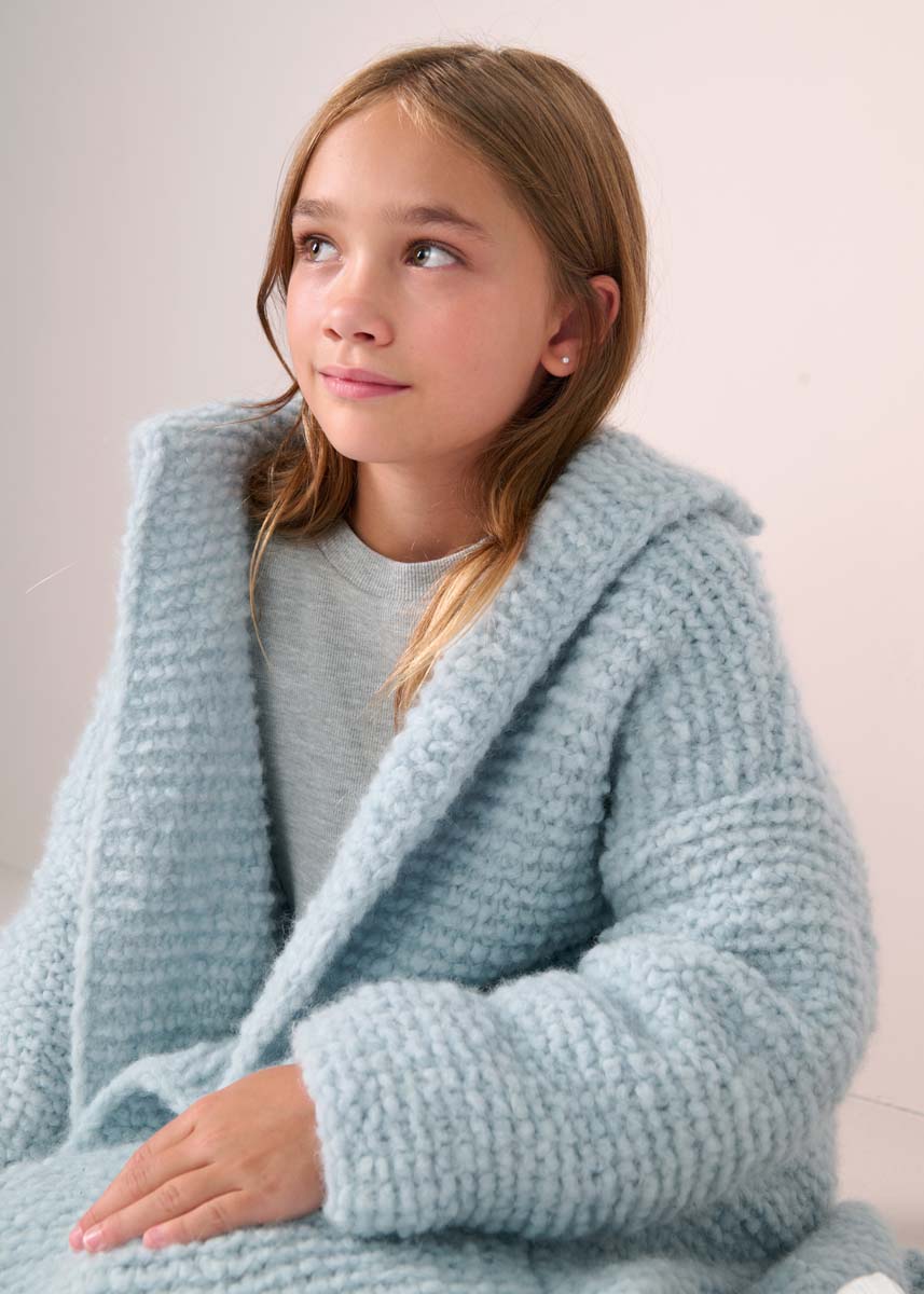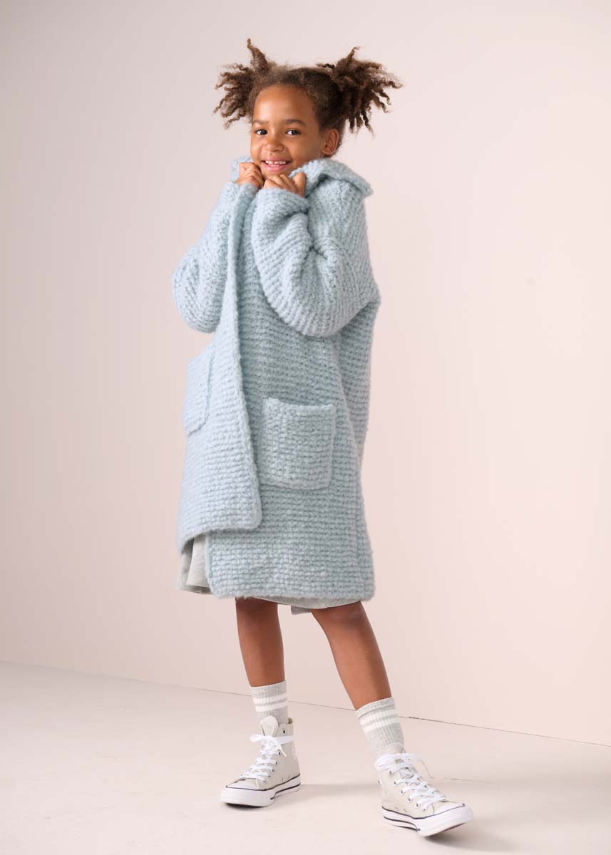 Lana Grossa-Qualität „Royal Alpaca“ (93% Alpaka (Royal), 7% Polyamid LL = ca 100 m/50 g): ca 350 (400 - 400 - 450) g Eisblau (Fb 9); Stricknadeln Nr 6; 1 Rundstricknadel Nr 6.