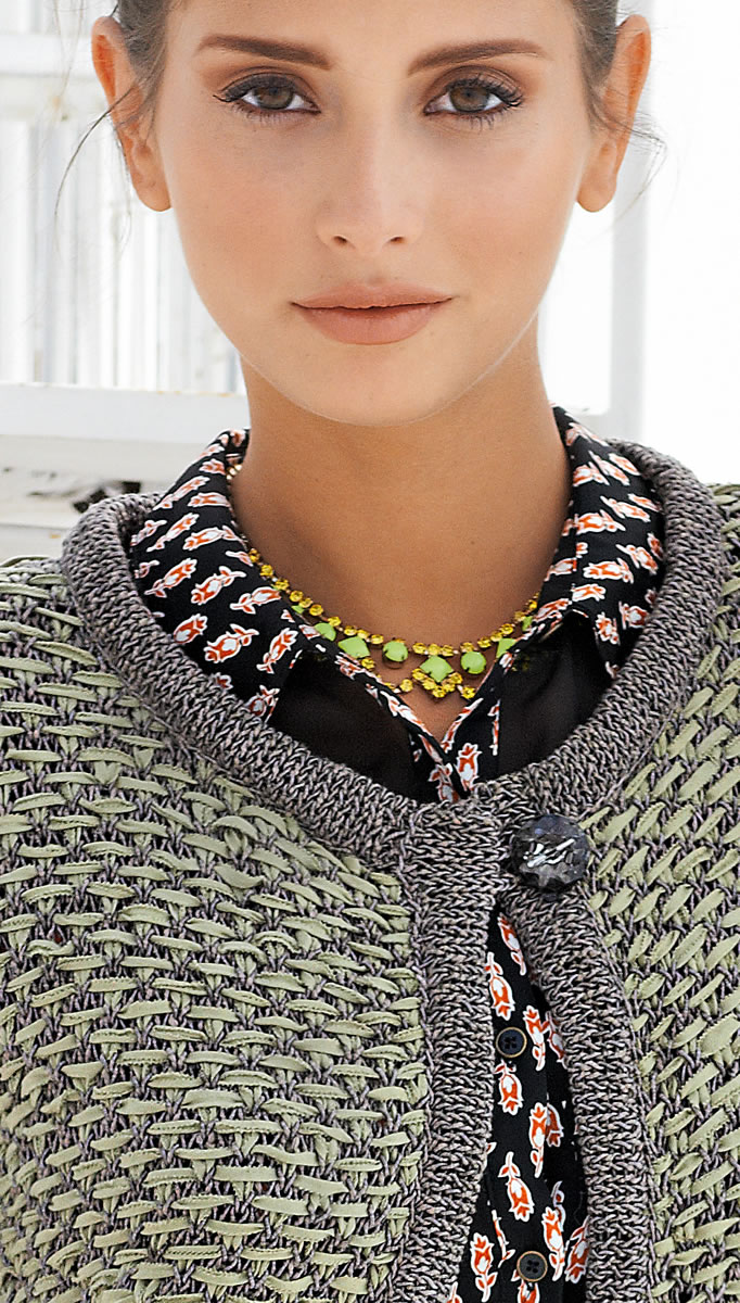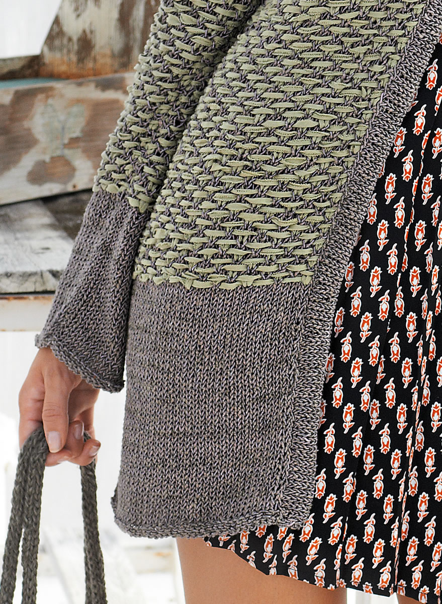 Lana Grossa Qualität „Secondo Big“, 70 % Baumwolle, 15 % Polyamid, 15 % Seide, Laufl änge 90 m/50 g; 700 (750) g Taupe (Fb 616) und „Paradiso“, 100 % Baumwolle, Laufl änge 65 m/50 g; ca. 250 (300) g Khaki (Fb 21), Rundstricknadeln Nr. 4,5, 5,5 und 7, eine Häkelnadel Nr. 4, ein Knopf.