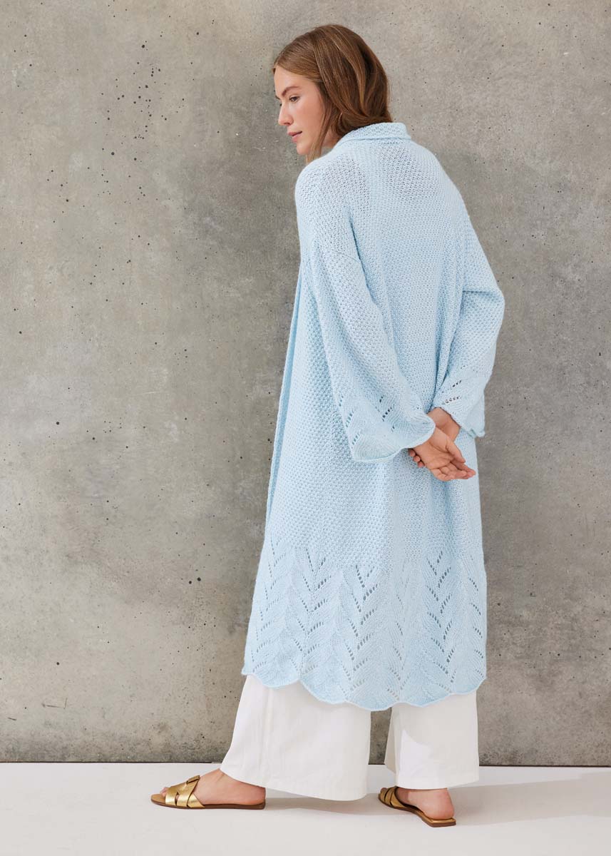 Lana Grossa-Qualität „Summer Softness“ (80 % Baumwolle (Bio), 20 % Schurwolle (Merino Superfine), LL = ca 130 m/50 g): ca 800 (900) g Pastellblau (Fb 17); Stricknadeln Nr 5,5.