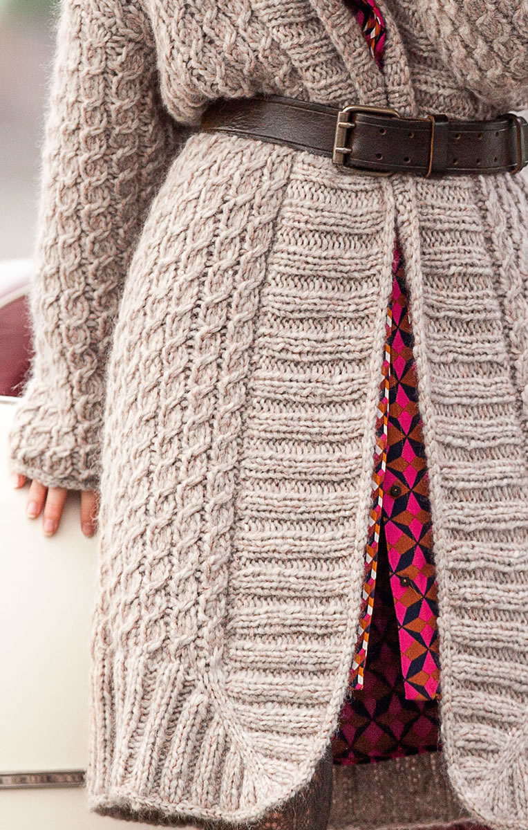 Fein gemacht: Beim aufwändigen Mantel in klassischem Taupe setzt Pailletten- Garn in zartem Rosé glamouröse Highlights.