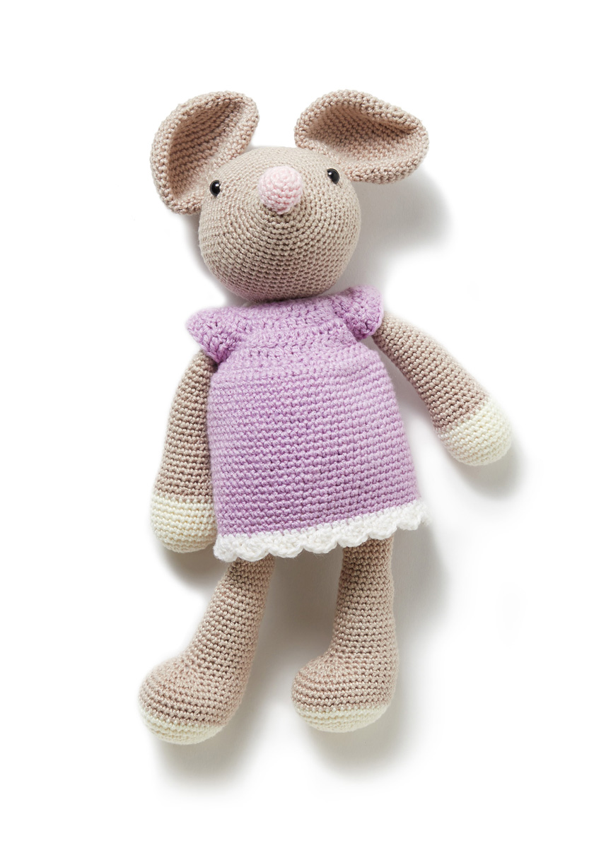 Lana Grossa-Qualität „Cotone“ (100 % Baumwolle; Lauflänge = 125 m/50 g): 100 g Beige (Fb 26), und je 50 g Rohweiß (Fb 28) und Rosa (Fb 122); Lana Grossa-Qualität „Alta Moda Cotolana“ (45 % Baumwolle (Pima), 45 % Schurwolle (Merino), 10 % Polyamid; Lauflänge = 150 m/50 g): je 50 g Orchideenrosa (Fb 42) und Weiß (Fb 18); je eine Häkelnadel 3 mm und 3,5 mm; zwei Sicherheitsaugen mit 6 mm Ø; Holzperle mit 10 mm Ø in Weiß; Füllwatte.