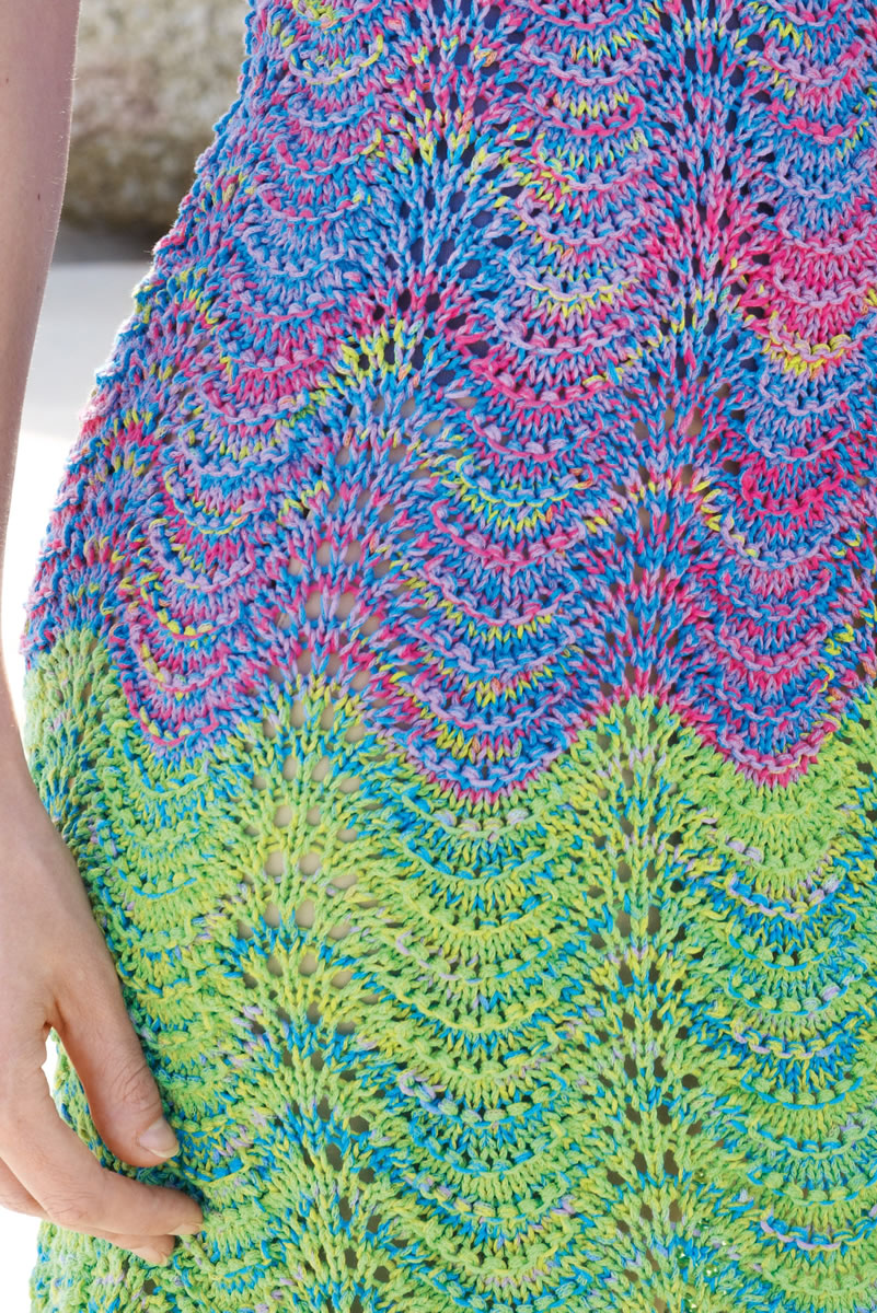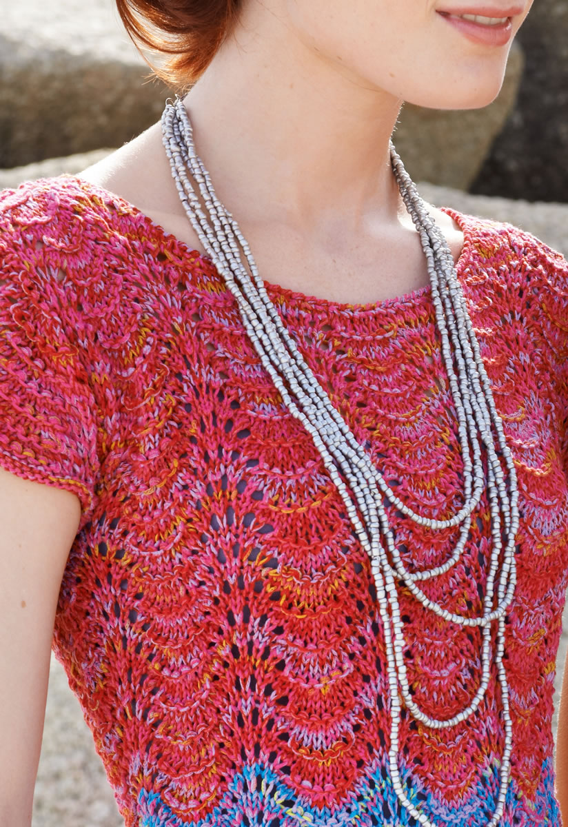 Lana Grossa-Qualität „Inside” (100 % Baumwolle, LL = ca. 150 m/50 g): je ca. 150 g Mauve/Lind-/Gelbgrün/Türkisblau (Fb. 9), Mauve/Pink/Türkisblau/Gelbgrün (Fb. 10) und Senfgelb/Pink/Rot/Mauve (Fb. 11); Stricknadeln Nr. 4 und 4,5, 1 Wollhäkelnadel Nr. 3,5