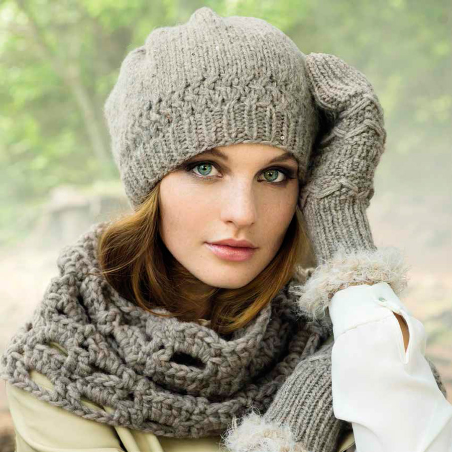 Lana Grossa-Qualität „Alta Moda Alpaca“ (90 % (Baby) Alpaka, 5 % Schurwolle, 5 % Polyamid, LL ca. 140 m/50 g): ca. 50 g Taupe (Fb. 15) und Lana Grossa-Qualität „Lace Paillettes“ (45 % (Baby) Alpaka, 20 % Schurwolle (Merino), 15 % Polyamid, 15 % Baumwolle, 5 % Polyester, LL ca. 150 m/25 g): ca. 25 g Taupe (Fb. 2); Spielstricknadeln Nr. 6,5 und 7.