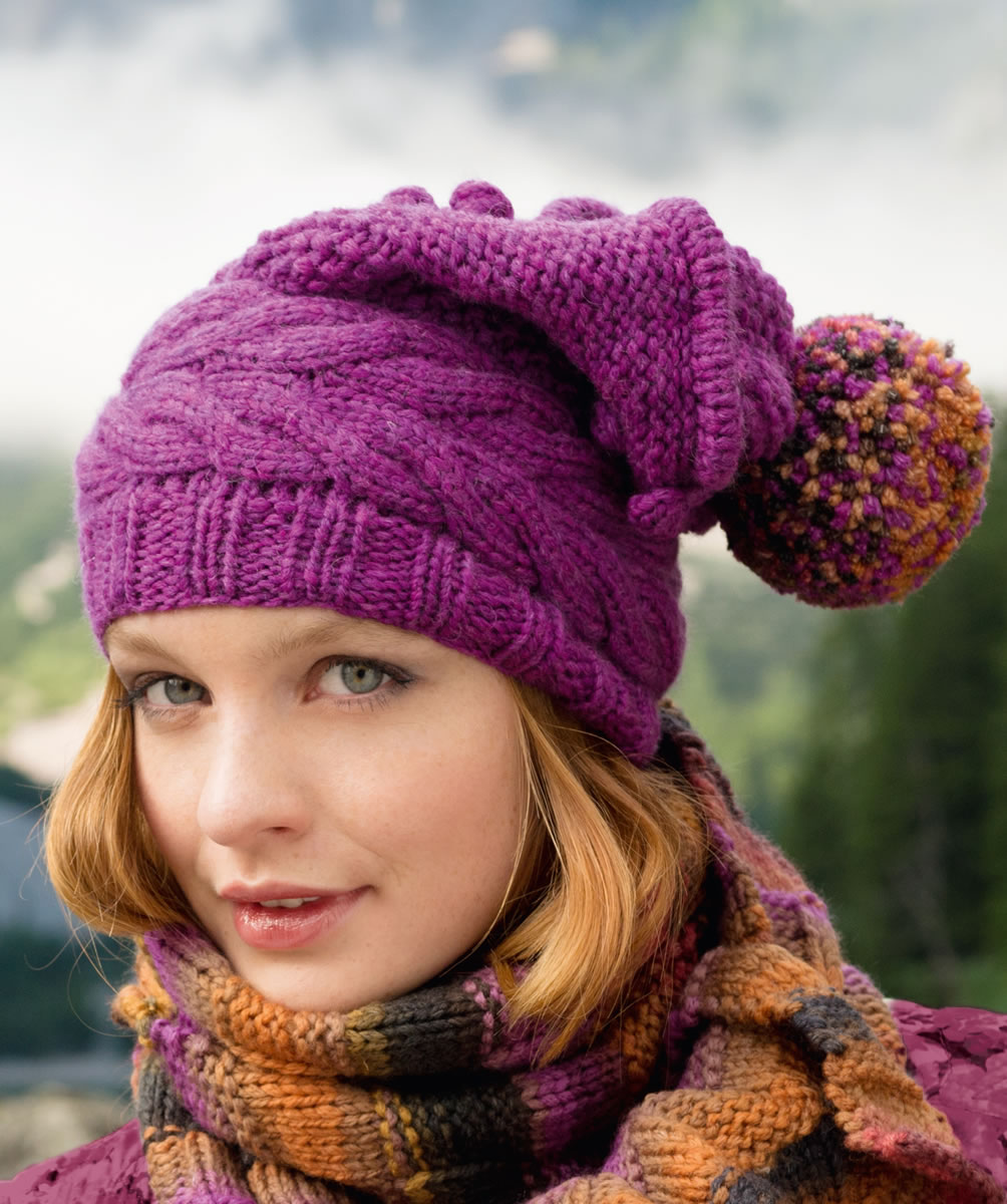Lana Grossa-Qualität „Alta Moda Cashmere“ (80 % Schurwolle (Merino), 15 % Kaschmir, 5 % Polyamid, LL ca. 90 m/50 g): ca. 150 g Viola (Fb. 33) und Lana Grossa-Qualität „Alta Moda Color“ (90 % Schurwolle (Merino), 10 % Polyamid, LL ca. 90 m/50 g): je ca. 50 g oder Reste Schwarzbraun/Goldbraun/Rost (Fb. 3), Dunkelbraun/Goldbraun/Senf (Fb. 11) und Rost/Camel/Viola (Fb. 12); Spielstricknadeln Nr. 5,5 und 6, 1 Rundstricknadel Nr. 5, 60 cm lang; 1 Pompon-Set von Lana Grossa.