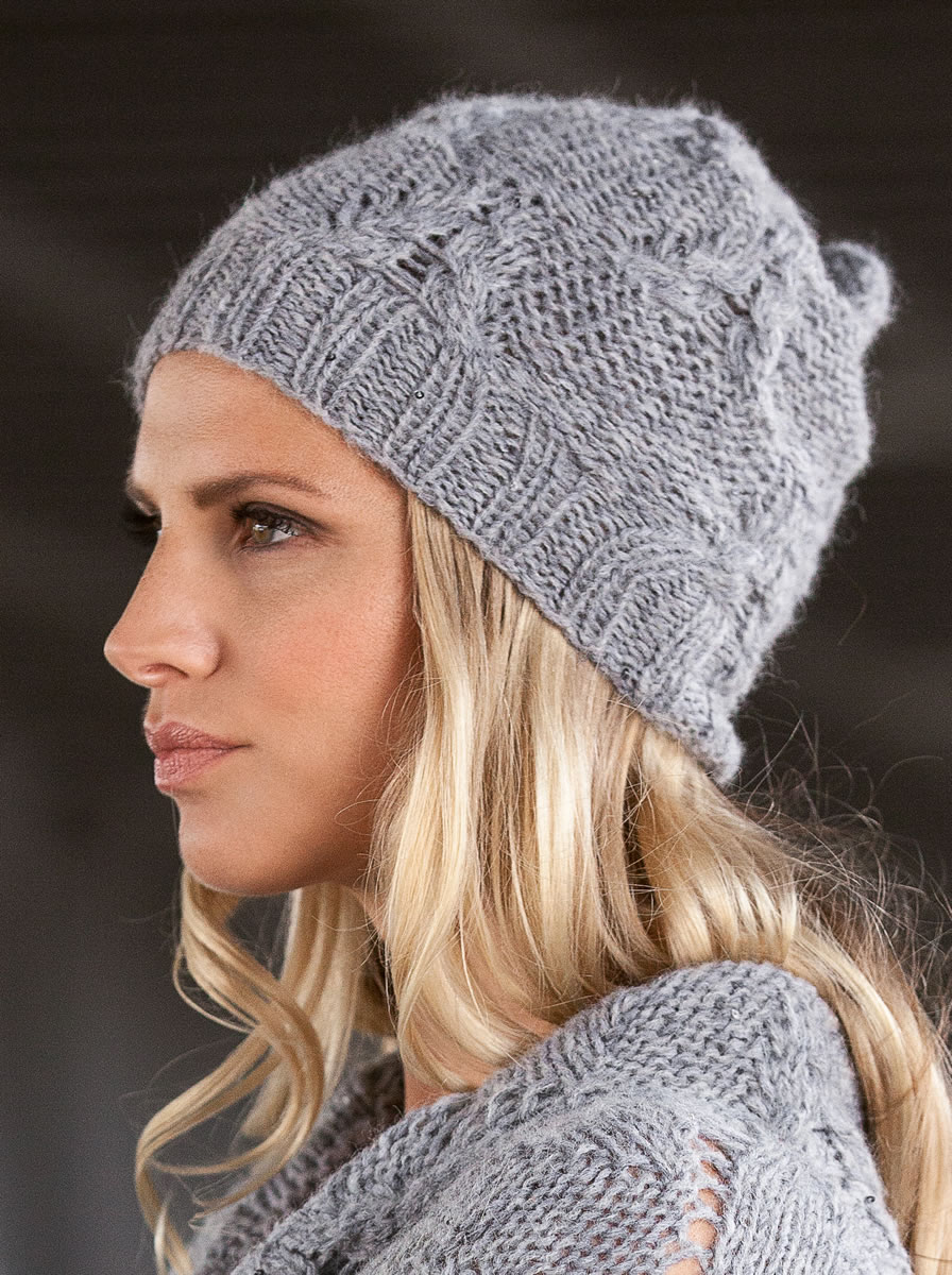 Lana Grossa Arioso (48 % Schurwolle, 30 % Alpaka, 22 % Polyamid, Lauflänge 240 m/50 g) 50 g Hellgrau (Fb 5) und Lace Paillettes (45 % Alpaka, 20 % Schurwolle, 15 % Polyamid, 15 % Baumwolle, 5 % Polyester, Lauflänge 150 m/25 g) 25 g Silbergrau (Fb 8); Spielstricknadeln Nr. 7