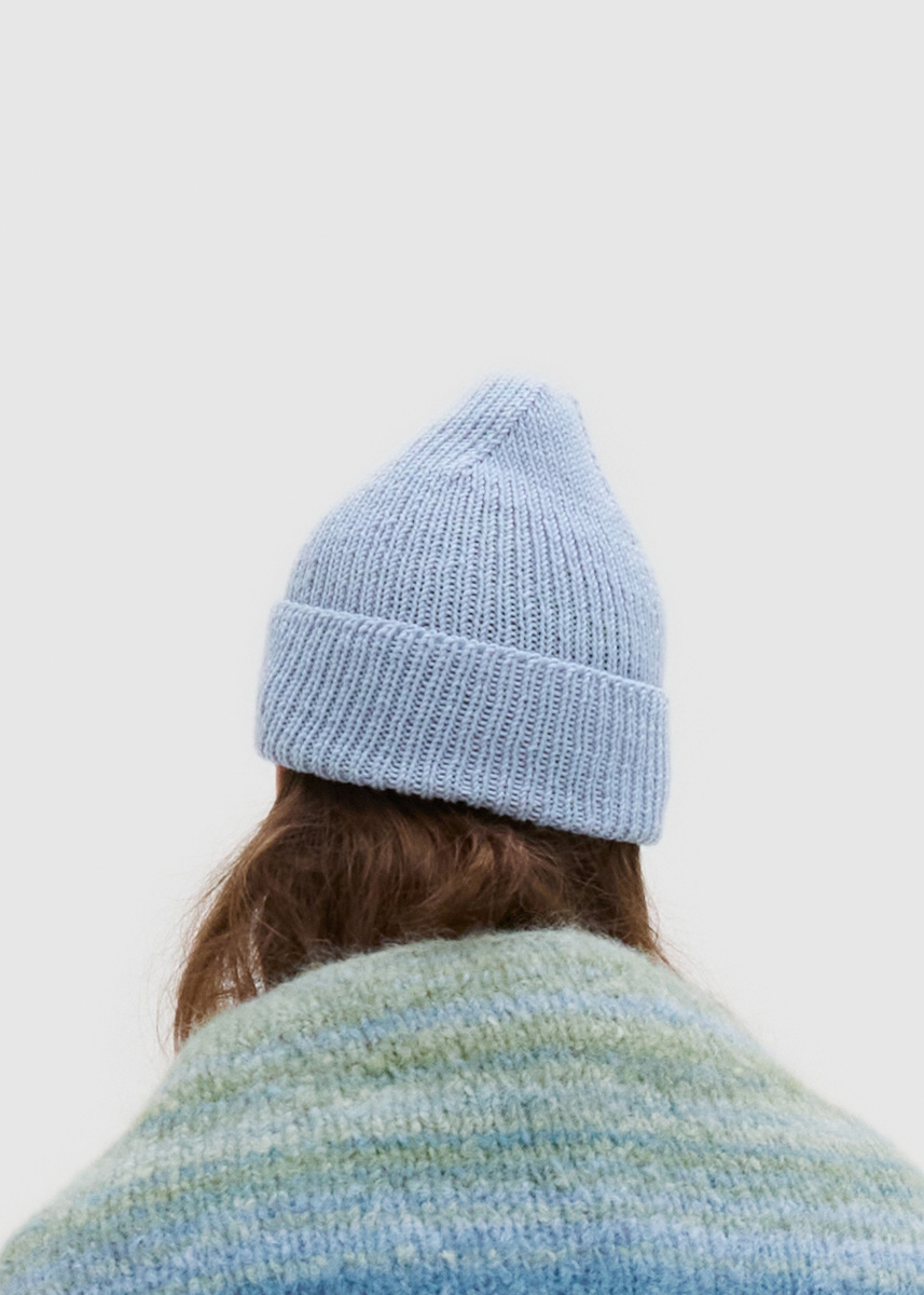 Lana Grossa „Cool Wool“ (100% Schurwolle (Merino extrafine), filzfrei, LL = 160 m/50 g): 100 g Zartblau (Fb 2119); Nadelspiel Nr 3,5; Maschenmarkierer.