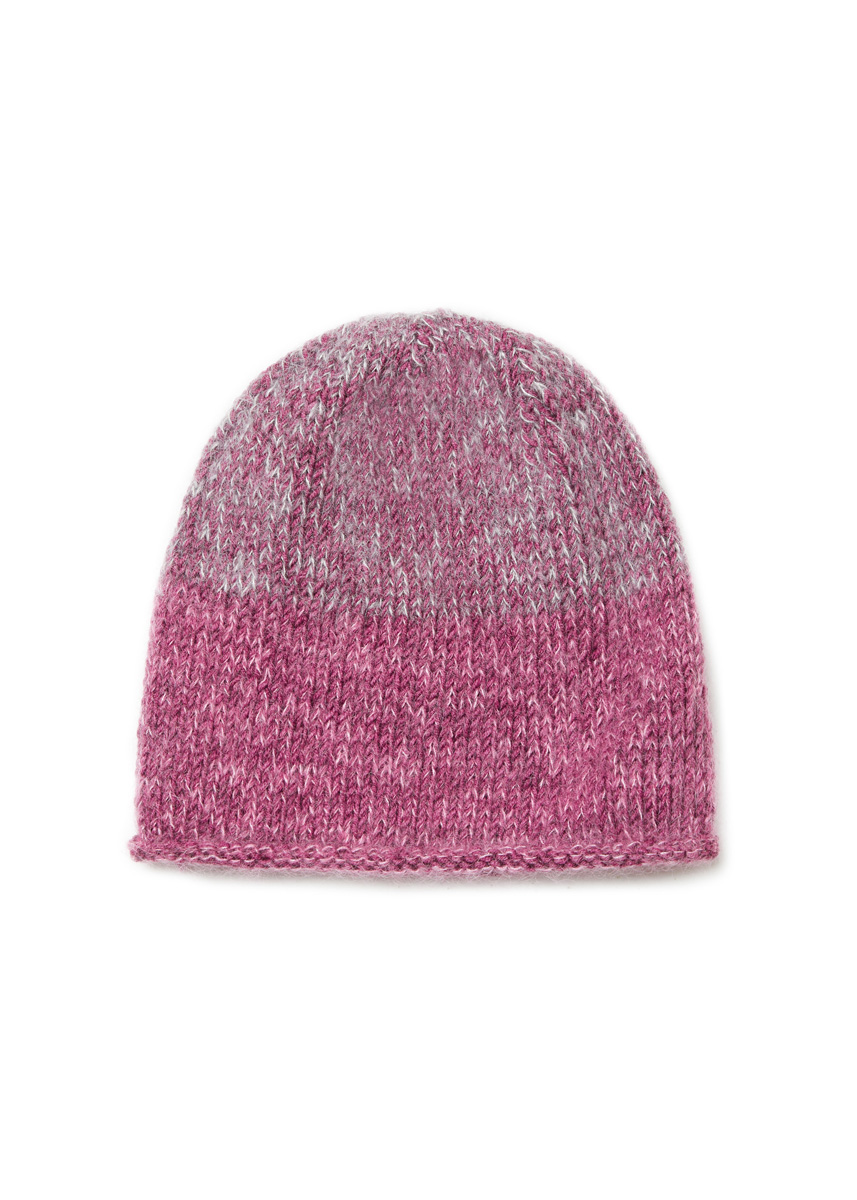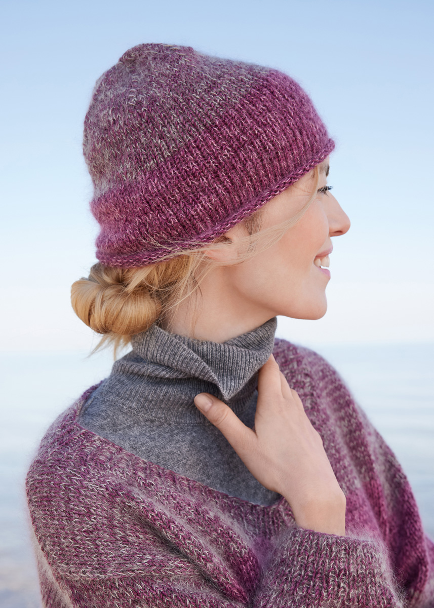 Lana Grossa Cool Wool Vintage (100 % Schurwolle (Merino extrafine), LL = ca 160 m/50 g), 50 g in Pflaume (Fb 7365). Lana Grossa Silkhair (70% Mohair (Superkid), 30% Seide, LL = ca. 210 m/25 g), je 25 g in Pink (Fb 162) und Perlweiß (Fb 58). 5 Spielstrick- Nd (= Nadelspiel) Nr. 4 und Nr. 4,5. Sechs MM.