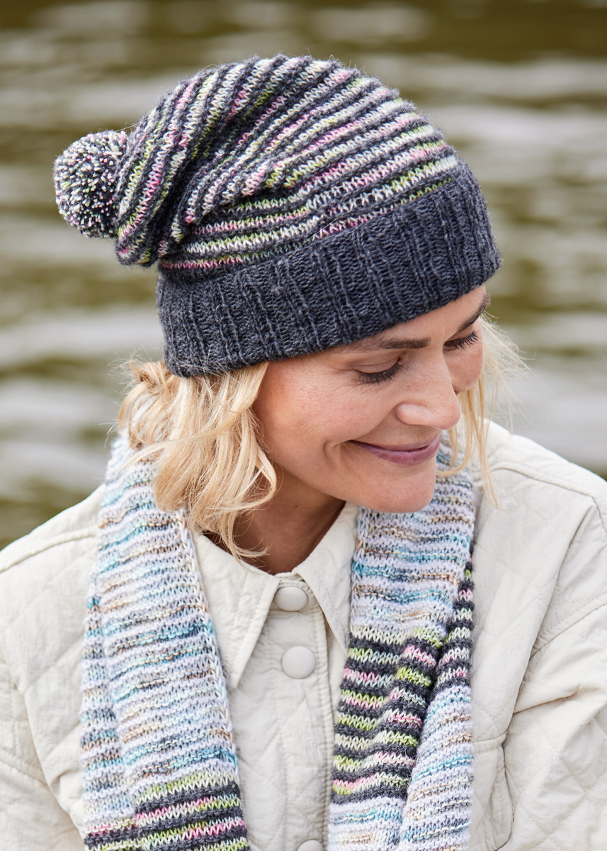 Glatt und kraus rechts gestrickte Streifen verleihen diesem Accessoire-Set einen interessanten, changierenden Look. Die Mütze wird hier in zwei Farben gezeigt, die beide mit dem Schal (Modell 21) harmonieren.