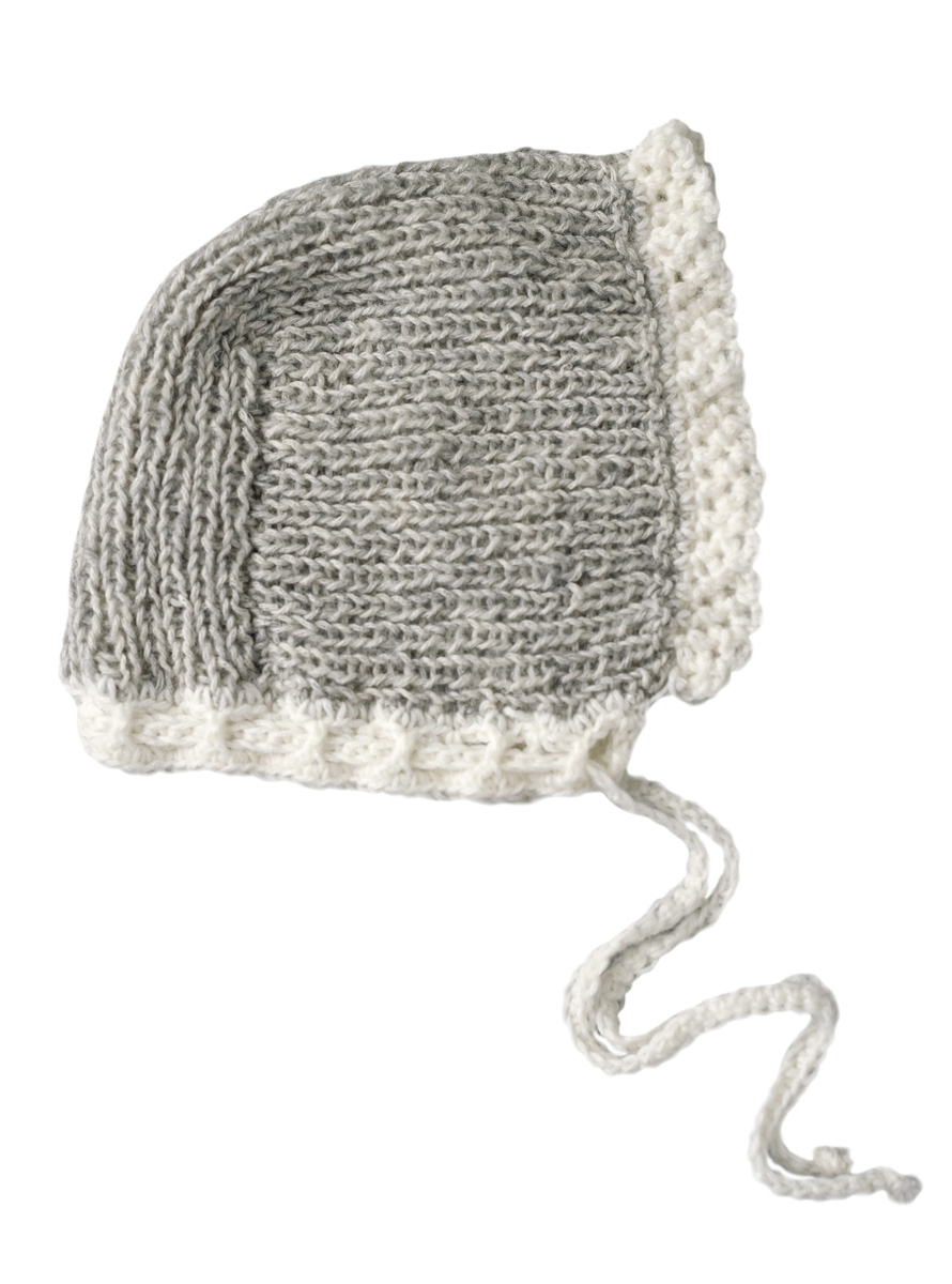 Lana Grossa Ecopuno (72 % Baumwolle, 17 % Schurwolle, 11 % Alpaka, Lauflänge 215 m/50 g) 50 g Hellgrau (Fb 14) und 50 g Weiß (Fb 26); Stricknadeln Nr. 4,5, Häkelnadel Nr. 4; ein Gummifaden.