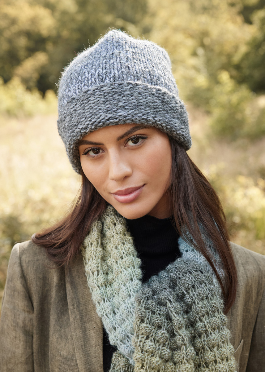 Lana Grossa-Qualität „Gomitolo Gala“ (60 % Schurwolle, 38 % Polyacryl, 2 % Polyester, LL = ca 700 m/200 g): 1 Knäuel = ca 200 g Hell-/Mittel-/Dunkelgrau (Fb 4023); 1 kurze Rundstricknadel oder Nadelspiel Nr 7.