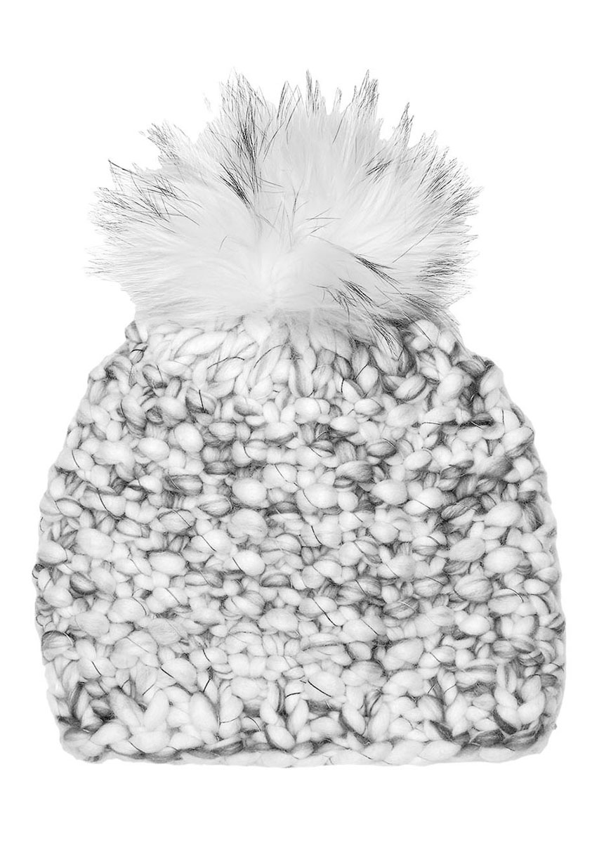 Lana Grossa-Qualität „Weekend Color” (69 % Schurwolle (Merino extrafi ne), 30 % (Baby) Alpaka, 1 % Baumwolle, LL = ca. 35 m/100 g): ca. 100 g Rohweiß/Oliv/ Graubraun (Fb. 105); Stricknadeln Nr. 15;1 Fellpompon „Finnraccoon Natur“ (100 % Finnraccoon) von Lana Grossa mit Annähdruckknopf, Art. 9779906, Fb. 115 polar.