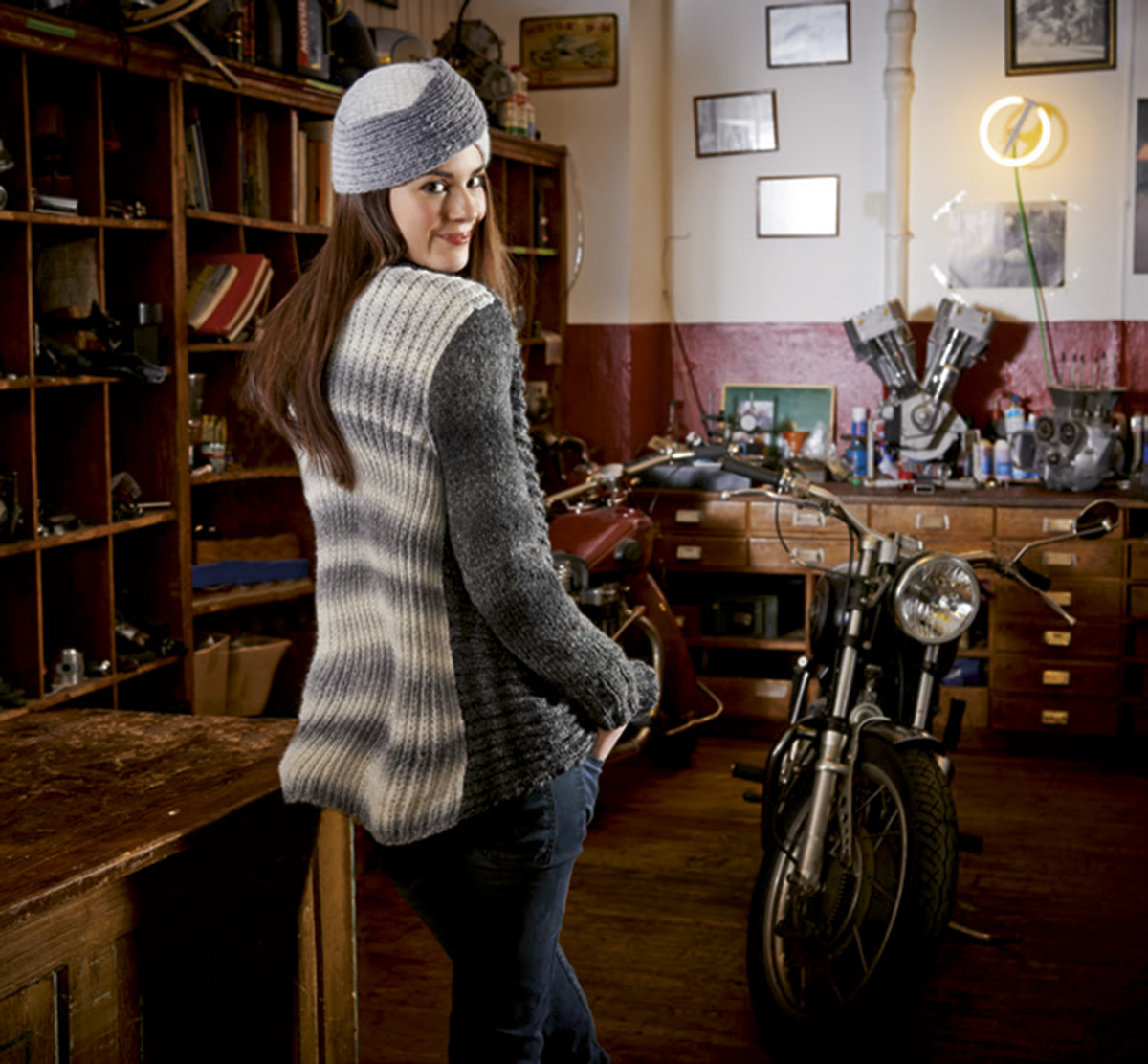 Lana Grossa-Qualität „Per Té“ (65% Schurwolle (Merino), 20% Polyacryl, 15% Poly- amid, Lauflänge ca. 120 m/50 g): Variante A: ca. 50 g Jeans/Marine/Schwarz (Fb. 3) oder Variante B: ca. 50 g Hell-/Mittel-/Dunkelgrau (Fb. 7) oder Variante C: ca. 50 g Petrol/Bordeaux/Anthrazit (Fb. 10); Stricknadeln Nr. 7.