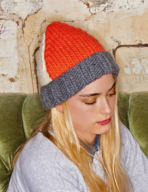 Lana Grossa-Qualität „Lei“ (100 % Schurwolle (Merino), Lauflänge ca. 40 m/50 g): je ca. 50 g Rohweiß (Fb. 14), Hummer (Fb. 38) und Dunkelgrau meliert (Fb. 12) und Lana Grossa-Qualität „Lei Mouliné“ (100 % Schurwolle (Merino), Lauflänge ca. 40 m/50 g): ca. 50 g Anthrazit/Rohweiß (Fb. 651); Spielstricknadeln Nr. 9, 1 Rundstricknadel Nr. 10, 60 cm lang