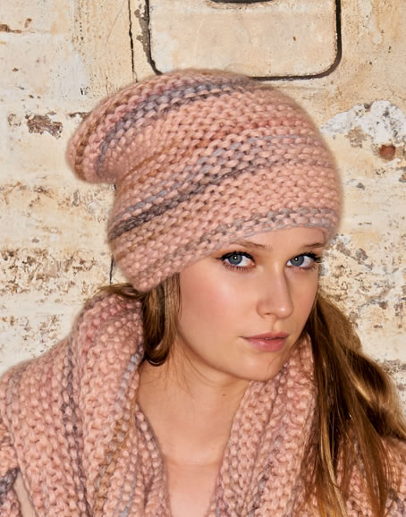 Lana Grossa-Qualität „Amici Due“ (51 % Schurwolle, 49 % Polyacryl, Lauflänge ca. 60 m/50 g): ca. 100 g Rosa/Puder/Creme (Fb. 109); Spielstricknadeln Nr. 8 und 10.