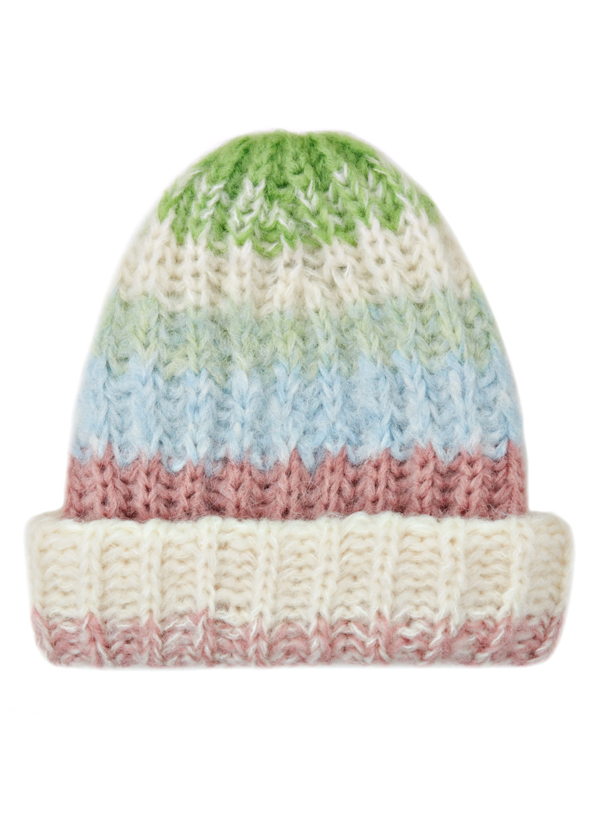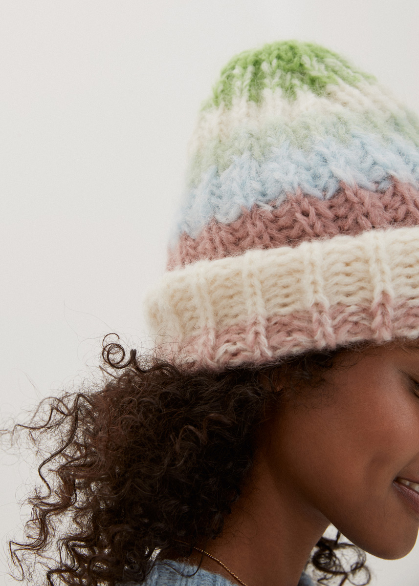 Lana Grossa-Qualität „Lala Berlin Brushy“ (42 % Mohair (Superkid), 38 % Schurwolle (Merino), 20 % Polyamid, Lauflänge 135 m/50 g): je ca. 50 g Rohweiß (Fb. 8), Giftgrün (Fb. 4) und Altrosa (Fb. 3) und Lana Grossa-Qualität „Lala Berlin Furry“ (90 % (Baby) Alpaka, 10 % Polyamid, Lauflänge 75 m/50 g): je ca. 50 g Weißblau (Fb. 21) und Pastellgrün (Fb. 23); Spielstricknadeln Nr. 9, 1 Rundstricknadel Nr. 9, 50 cm lang, 1 Wollnadel von Lana Grossa.