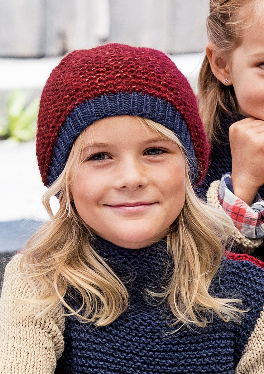 Lana Grossa Lala Berlin Shiny (46% Baby Alpaka, 30% Baumwolle, 8% Schurwolle Merino, 8% Polyester, 8% Polyamid, Lauflänge 150 m/50 g), 50 g Dunkelrot (Fb 4) und Lana Grossa Bingo Melange (100% Schurwolle, Lauflänge 80 m/50 g), 50 g Nachtblau meliert (Fb 251); 1 Spiel Stricknadeln Nr. 4,5 und 6