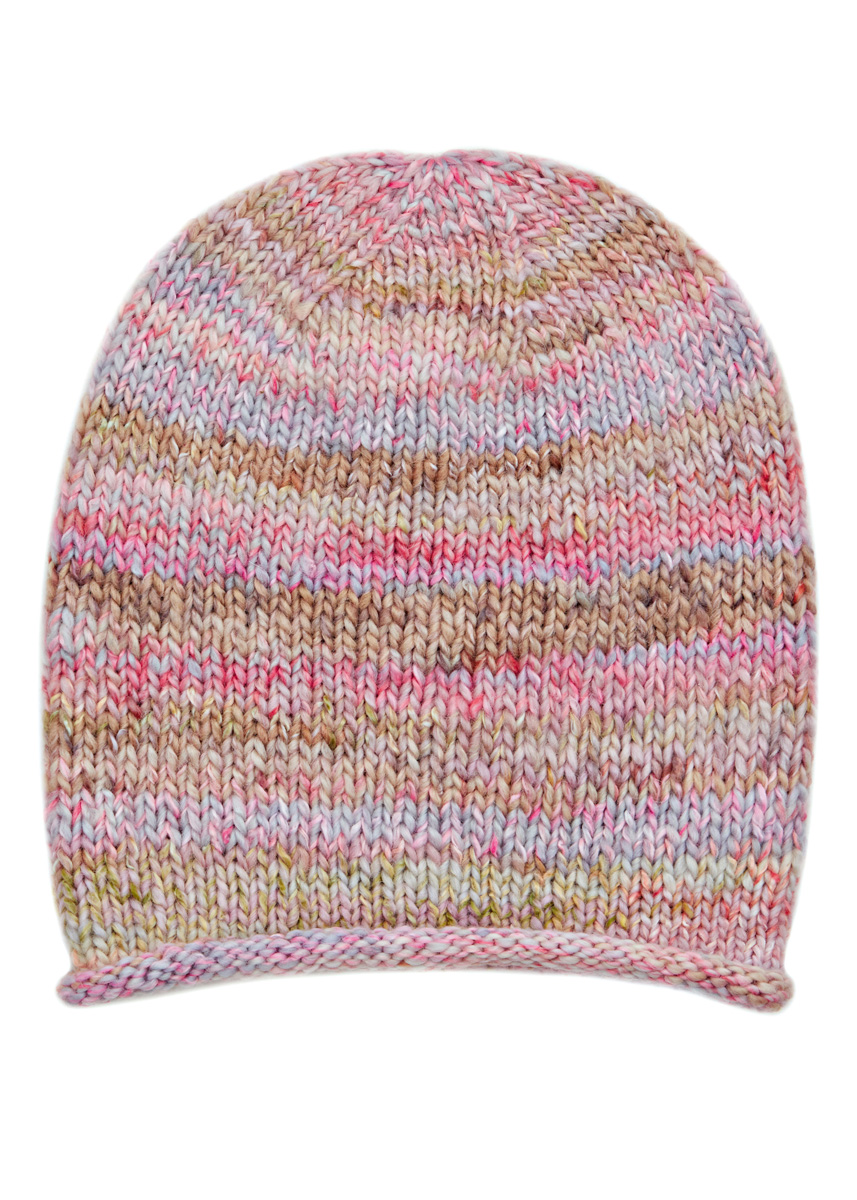 Lana Grossa-Qualität „Lala Berlin Stripy“ (56 % Schurwolle (Merino), 29 % Polyacryl, 14 % (Baby) Alpaka, 1 % Elasthan, Lauflänge 90 m/50 g): ca. 100 g Rosa/Lichtgrün/Beige/Natur/Flieder/Hellgrau (Fb. 10); Spielstricknadeln Nr. 7, je 1 Rundstricknadel Nr. 6 und 7, 50 cm lang, 1 Wollnadel von Lana Grossa.