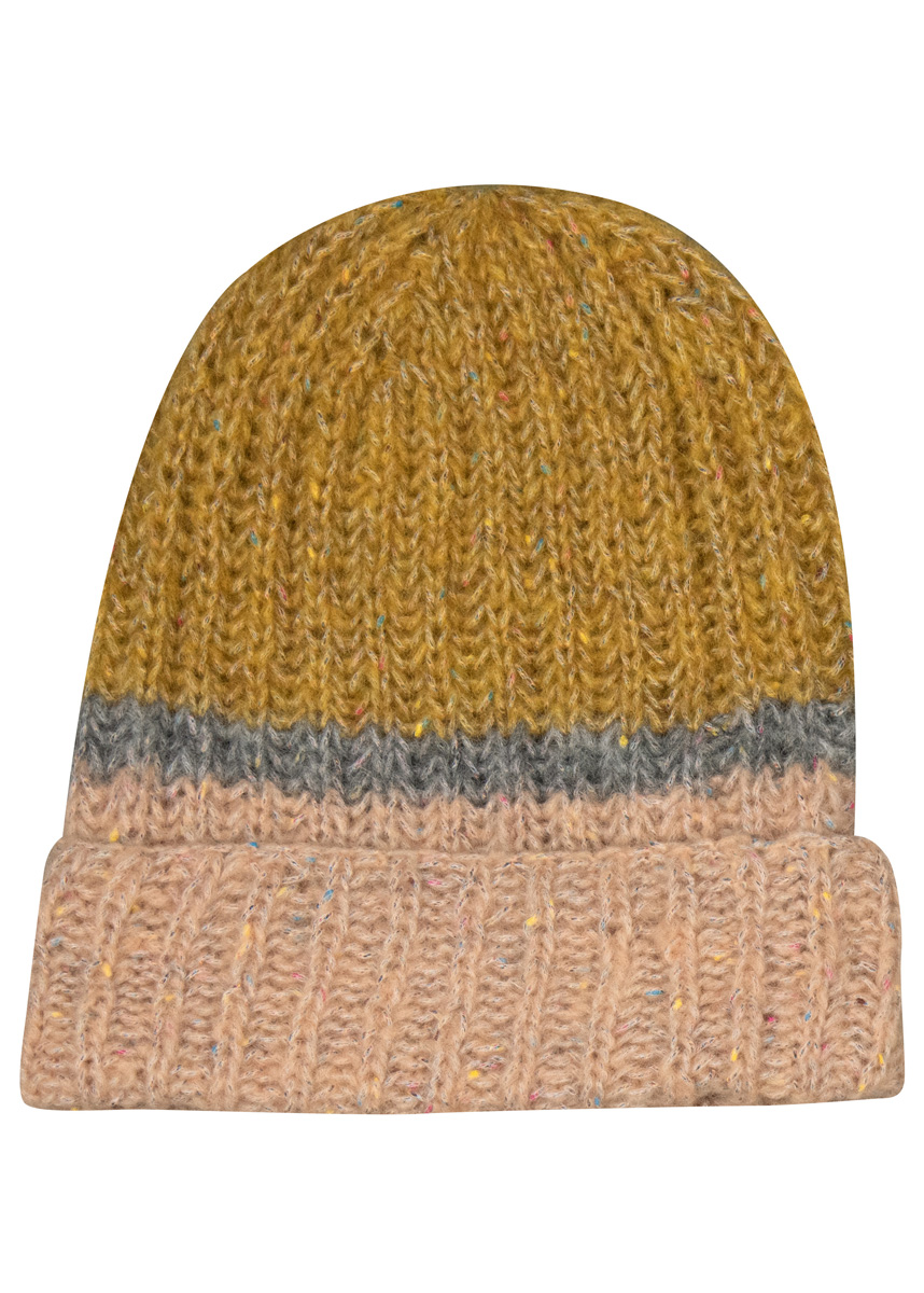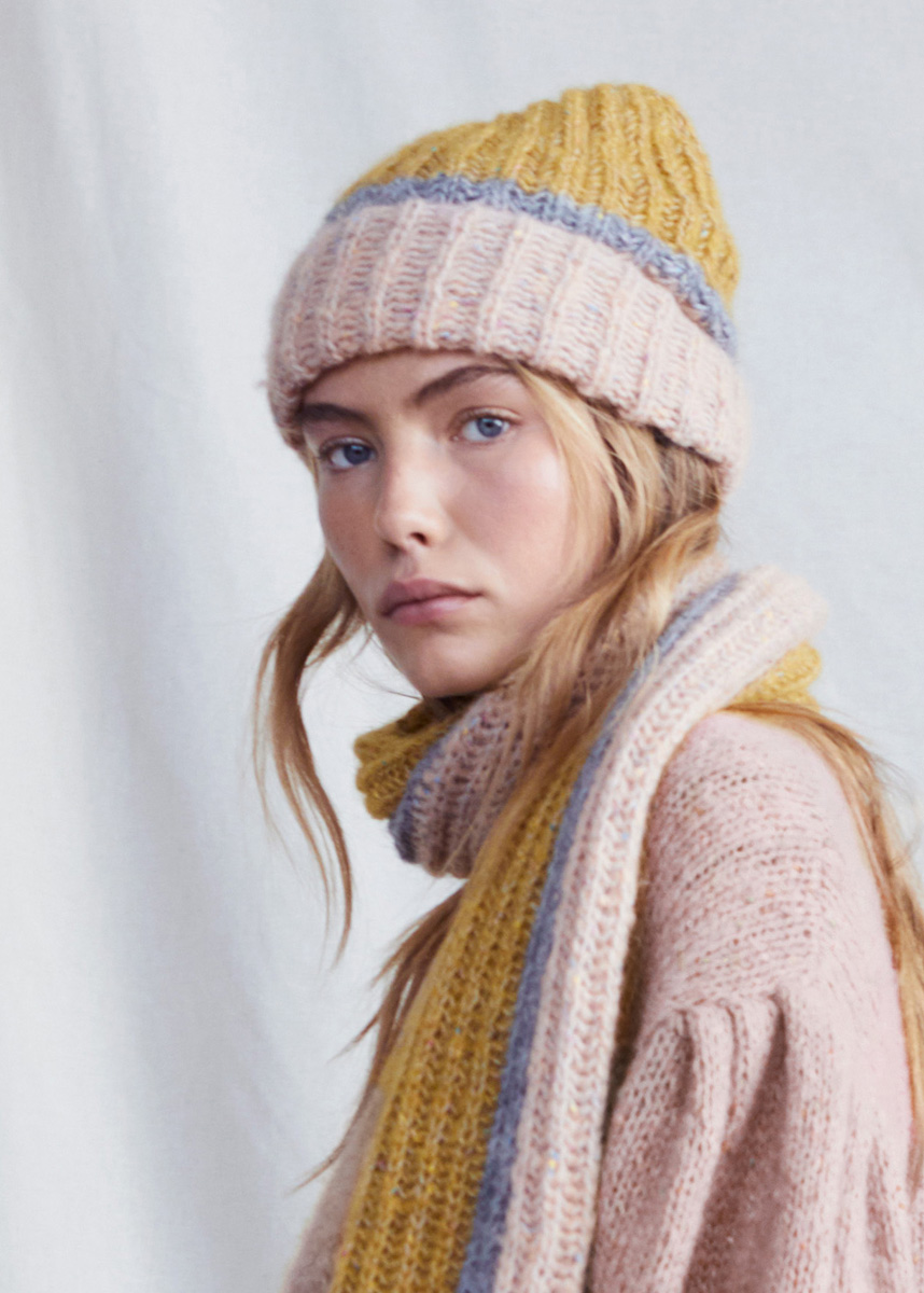 Lana Grossa „Lala Berlin Tweedy“ (33% Baby Alpaka, 31% Polyamid, 30% Baumwolle, 6% Schurwolle Merino, Lauflänge 125 m/50 g), 50 g Gelb (Fb 9), 50 g Pfirsich (Fb 2) und 50 g Grau (Fb 5); 1 Spiel Stricknadeln Nr. 6.