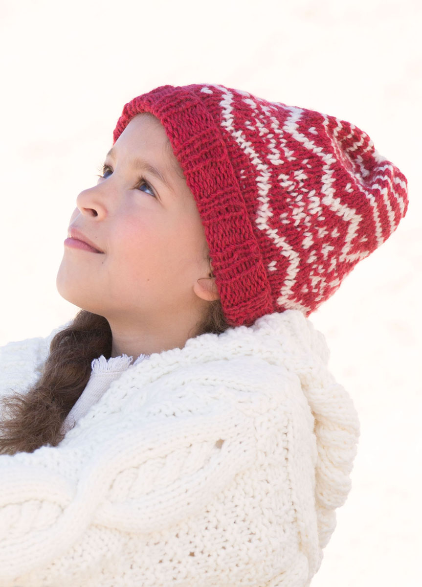 Lana Grossa Landlust Merino 120 (100% Schurwolle Merino superwash, Lauflänge 120 m/50 g), 50 g Burgund (Fb 112) und 50 g Rohweiß (Fb 101); 1 Spiel Stricknadeln Nr. 5,5 und 7.