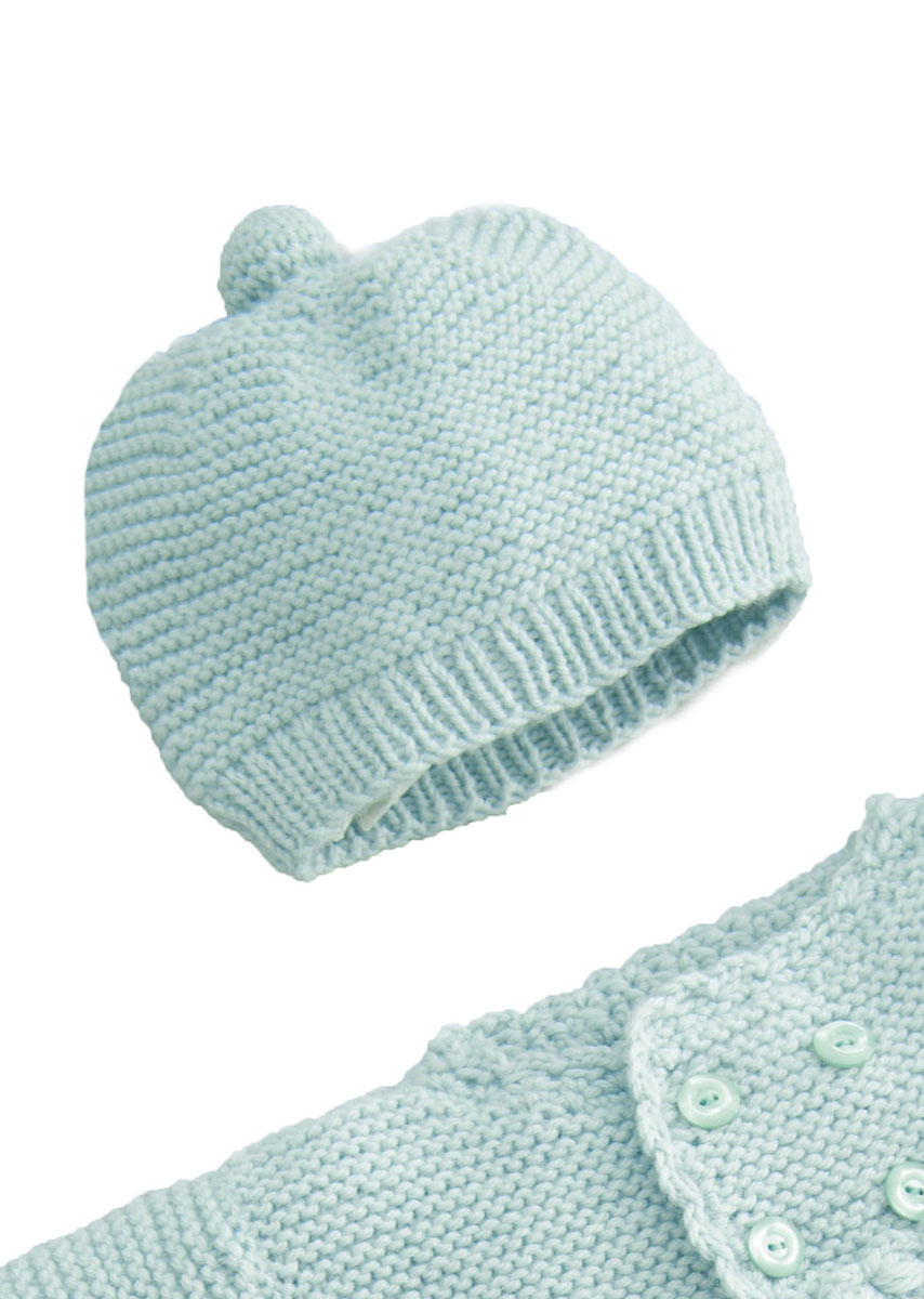 Psst! Bitte nicht stören! Denn zum Wohlfühlprogramm gehört, neben einem entspannten Nickerchen, etwas Bequemes, Weiches und Pflegeleichtes zum Anziehen. Wie dieses Set, zu dem ein Jäckchen mit einer Häkelborte aus quergelegten Büschelstäbchen an der Passe gehört, eine superbequeme Schlupfhose mit hohem Bündchen und eine wärmende Mütze.
