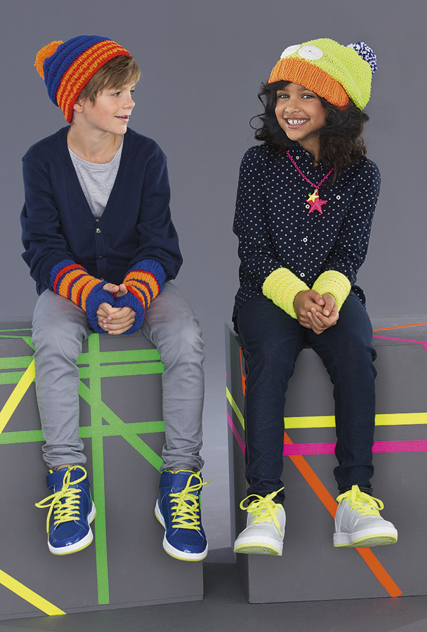 Lana Grossa Qualität „Mc Wool Neon Sport“ (60% Schurwolle, 40% Acryl, LL = 65 m/50 g), ca. 100 g Royal (Fb 105) und je ca. 50 g Orange (Fb 103) und Rot (Fb 106), 1 Spielstricknadeln Nr. 5, 1 Pomponset von Lana Grossa.