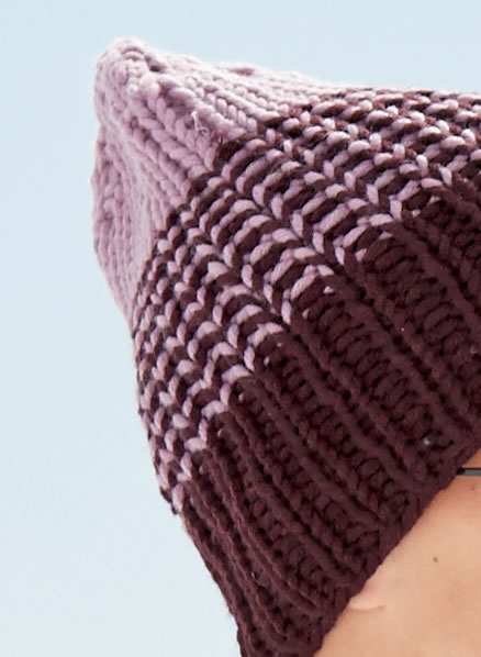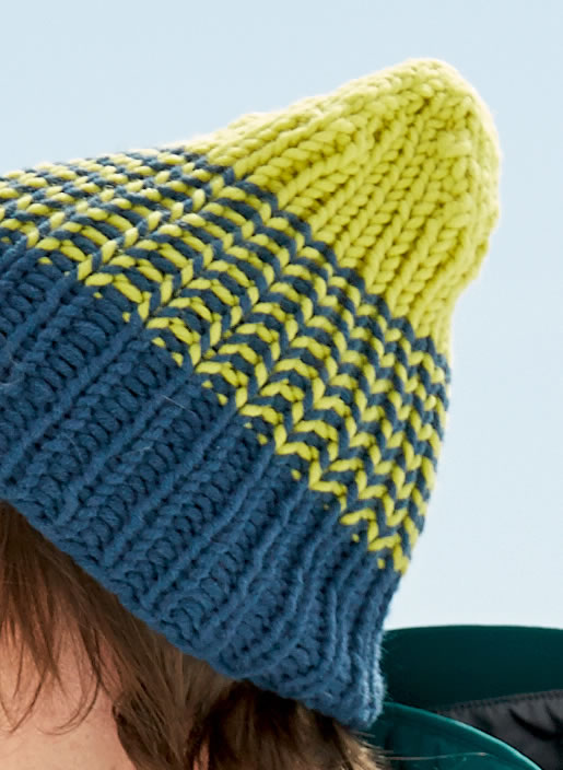 Lana Grossa Qualität „Mille II“ (50 % Schurwolle, 50 % Polyacryl, Lauflänge 55 m/50g): für Mütze A: je ca. 50 g dunkles Petrolblau (Fb 23) und Pistazie (Fb 61) oder für Mütze B: Brombeer (Fb 73) und Antikviolett (Fb 66); Spielstricknadeln Nr. 8.