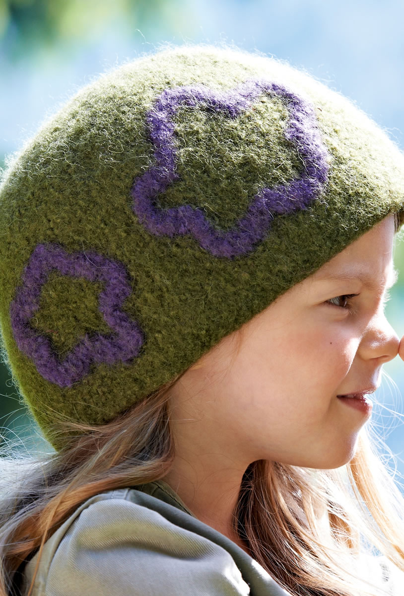 Lana Grossa Qualität„Feltro“(100% Schurwolle, LL = 50 m/50 g), ca. 150 g Dunkeloliv (Fb 61) und ca. 50 g Pflaume (Fb 54), 1 Spiel Stricknadeln Nr. 10 und 1 Häkelnadel Nr. 10.