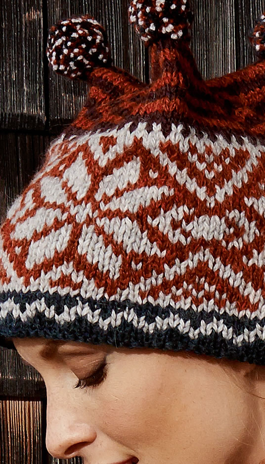 Lana Grossa-Qualität „Alta Moda Alpaca“ (90 % (Baby) Alpaka, 5 % Schurwolle (Merino), 15 % Polyamid, LL ca. 11450 m/50 g): je ca. 50 g Rost meliert (Fb. 34), Grège (Fb. 21), Petrol/Nachtblau meliert (Fb. 37) und Burgund meliert (Fb. 32); Spielstricknadeln Nr. 6 und 7; evtl. 1 Pompon-Set von Lana Grossa.
