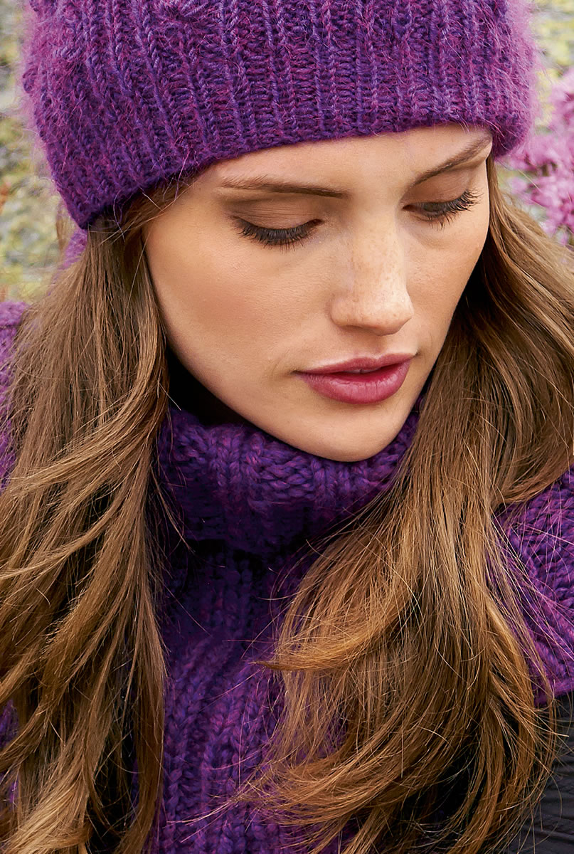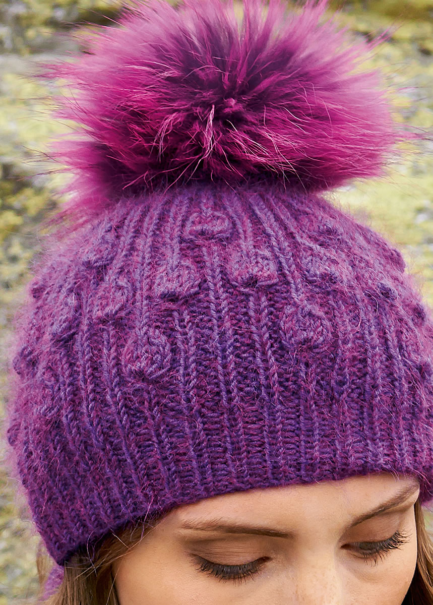 Lana Grossa-Qualität „Cool Wool“ (100 % Schurwolle (Merino extrafine, filzfrei), LL ca. 160 m/50 g): ca. 100 g Rotviolett (Fb. 547) und Lana Grossa-Qualität „Silkhair Melange“ (70 % Mohair (Superkid), 30 % Seide, LL ca. 210 m/25 g): ca. 25 g Rotviolett meliert (Fb. 710); Spielstricknadeln Nr. 5, 1 Rundstricknadel Nr. 5, 60 cm lang; 1 Fellpompon mit Druckknopf von Lana Grossa „Finnraccoon Multicolor“, Fb. 141 lila/pink.