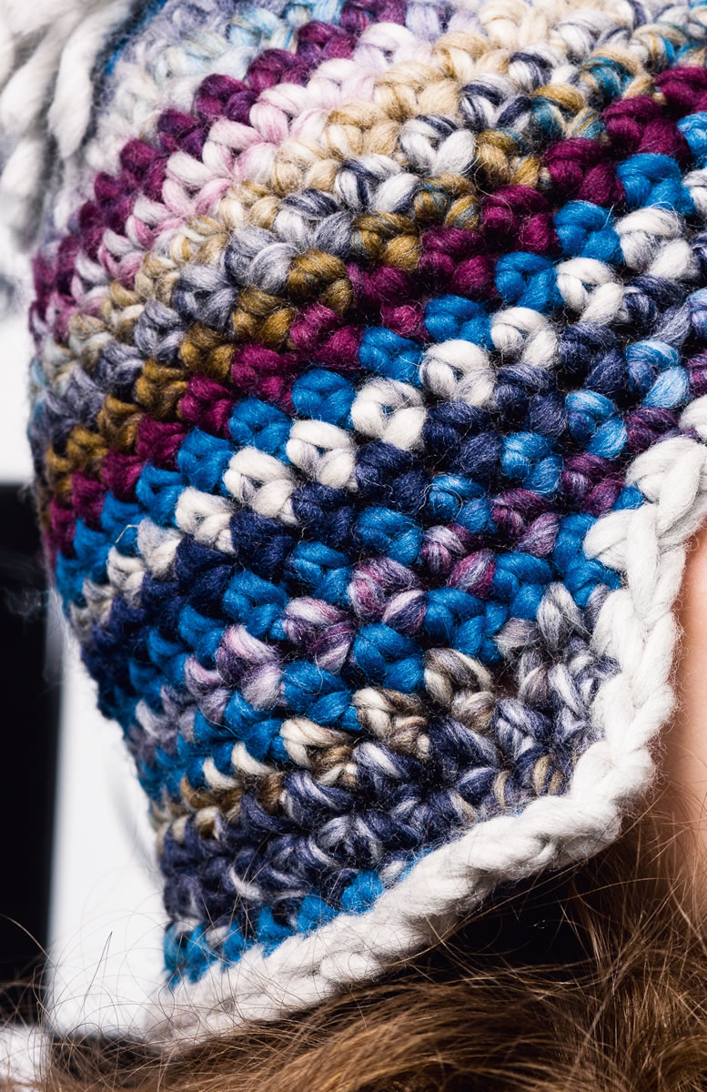 Lana Grossa-Qualität „Lei Colormix” (100 % Schurwolle (Merino), LL = ca. 40 m/50 g): je ca. 50 g Rotviolett/Aubergine/Blau/Hellgrau (Fb. 154) und Natur/Flieder/Khaki/Petrol (Fb. 254) und Lana Grossa-Qualität „Lei” (100 % Schurwolle (Merino), LL = ca. 40 m/50 g): ca. 50 g oder Reste in Hellgrau/Natur meliert (Fb. 34); 1 Wollhäkelnadel Nr. 10.