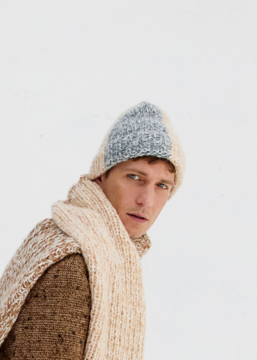 Lana Grossa „Nebbia“ (55% Schurwolle (Merino extrafine), 45% (Baby) Alpaka, LL = 170 m/50 g): Je 50 g Dunkelgrau (Fb 7), Camel (Fb 12), Beige (Fb 13) und Rohweiß (Fb 15); Strick-Nd Nr 8 und Nr 10.
