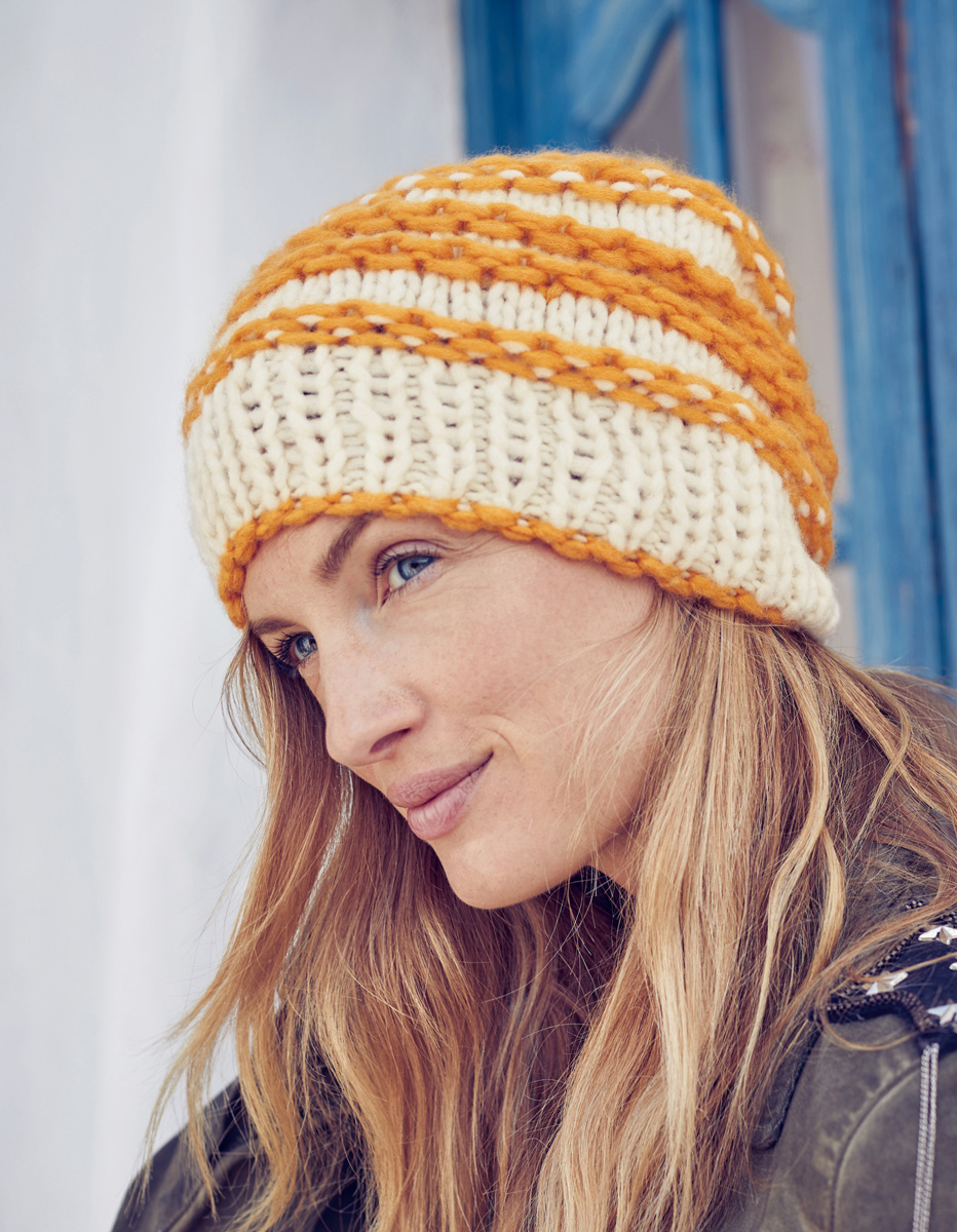 Lana Grossa Lala Berlin Lovely Cashmere (60% Kaschmir, 25% Polyamid, 15% Schurwolle, Laufl änge 60 m/25 g), 50 g in Rohweiß (Fb 7) und 25 g in Dottergelb (Fb 1); Nadelspiel Nr. 8,0 und 10,0; Stricknadel Nr. 8,0.
