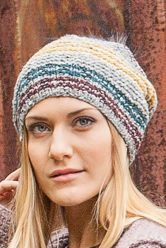 Lana Grossa „Royal Tweed” (100% Schurwolle, LL = 100 m/50 g) je 50 g Dunkelgrau meliert (Fb 14), Burgund meliert (Fb 71), Schwarzgrün meliert (Fb 76), Hellbeige meliert (Fb 8), Senf meliert (Fb 80). Eine Rundstrick- nadel Nr. 4 und 5, ein Nadelspiel Nr. 5. Fellpompon in Schwarz (von Lana Grossa).