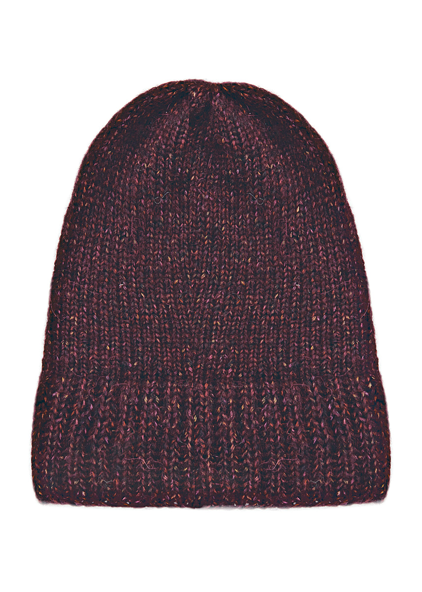 Lana Grossa-Qualität „Sara“ (65 % Baumwolle, 30 % (Baby) Alpaka, 5 % Schurwolle (Merino), Lauflänge 125 m/50 g): ca. 50 g Aubergine meliert (Fb. 15); Spielstricknadeln Nr. 4,5, 1 Rundstricknadel Nr. 4,5, 40 cm lang, 1 Wollnadel von Lana Grossa. Hinweis: Bei uns hat die Mütze 45 g gewogen. Falls Sie mehr Garn brauchen, sollten Sie evtl. 2 Knäuel kaufen.