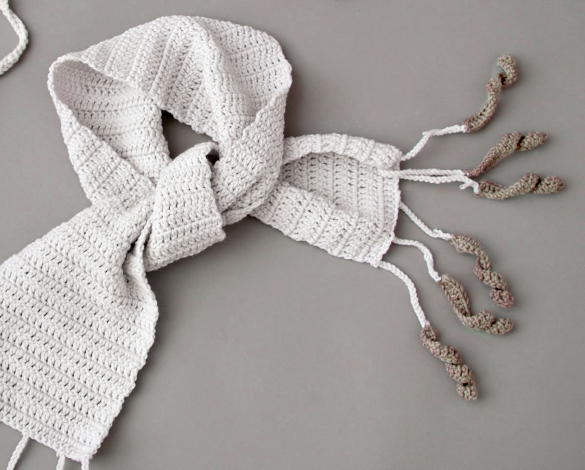 Lana Grossa Qualität Cool Wool Big, 100 % Schurwolle, Lauflänge 120 m/50 g; 200 g Blassgrau (Fb 929) und 50 g Taupe (Fb 686); Spielstricknadeln Nr. 4, eine Häkelnadel Nr. 4.