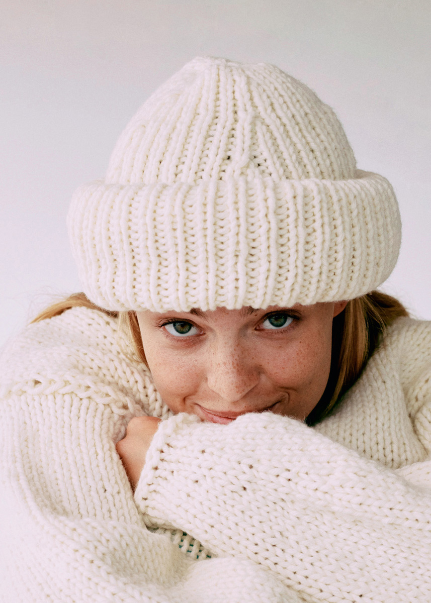 Lana Grossa-Qualität „Woohoo“ (100 % Schurwolle (Merino), LL = ca 250 m/200 g): ca 200 g Rohweiß (Fb 1); 1 kurze Rundstricknadel oder Nadelspiel Nr 6,5.