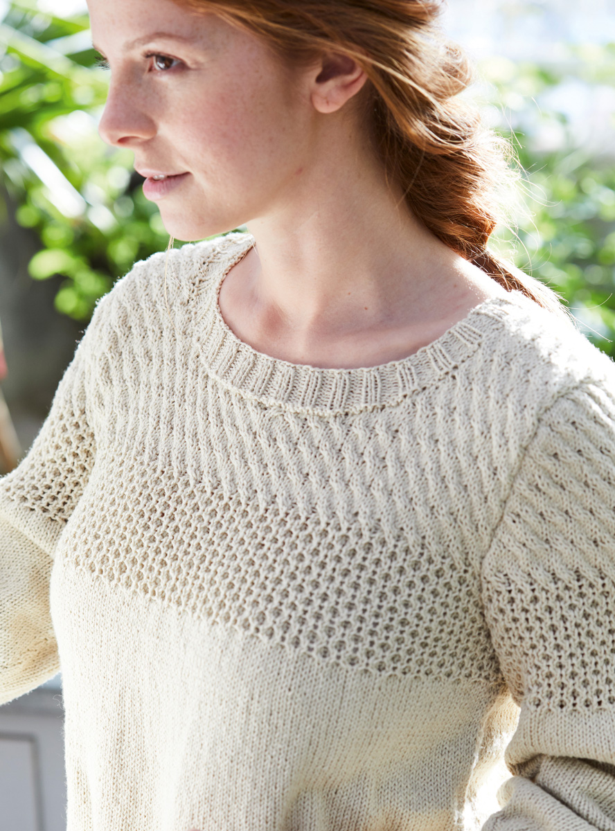 Lana Grossa-Qualität „Landlust Sommerseide“ (50% Seide, 50% Baumwolle, LL ca. 170 m/50 g), ca. 400 (450 - 500 - 550) g Natur (Fb 2); Stricknadeln Nr. 3 und 3,5 und eine 40 cm lange Rundstricknadel Nr. 3, eine Hilfsnadel