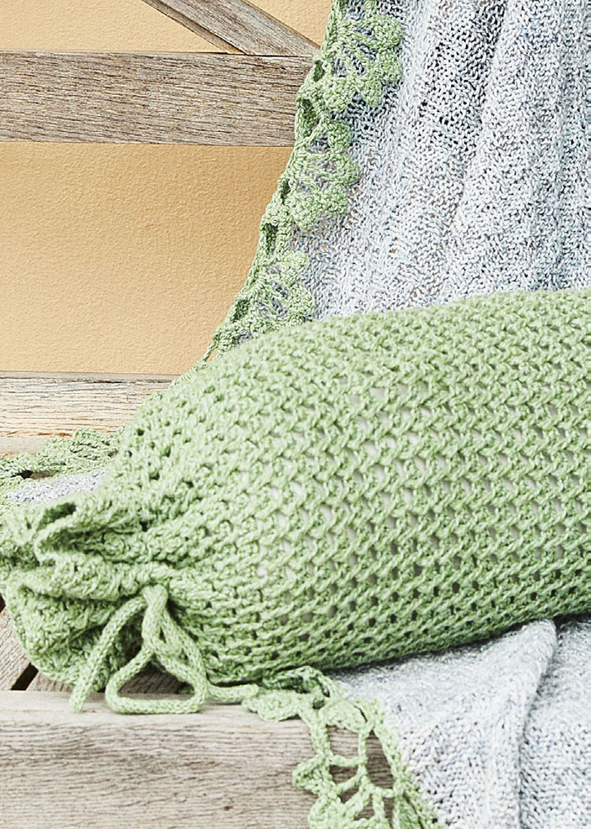Lana Grossa-Qualität „Landlust- Sommerseide“ (50% Seide, 50% Baumwolle, LL ca. 170 m/ 50 g), 250 g in Apfelgrün (Fb 36); 1 Häkelnadel Nr. 3, 1 Füllung für Nackenrollen, 45 cm lang, 16 cm Ø.