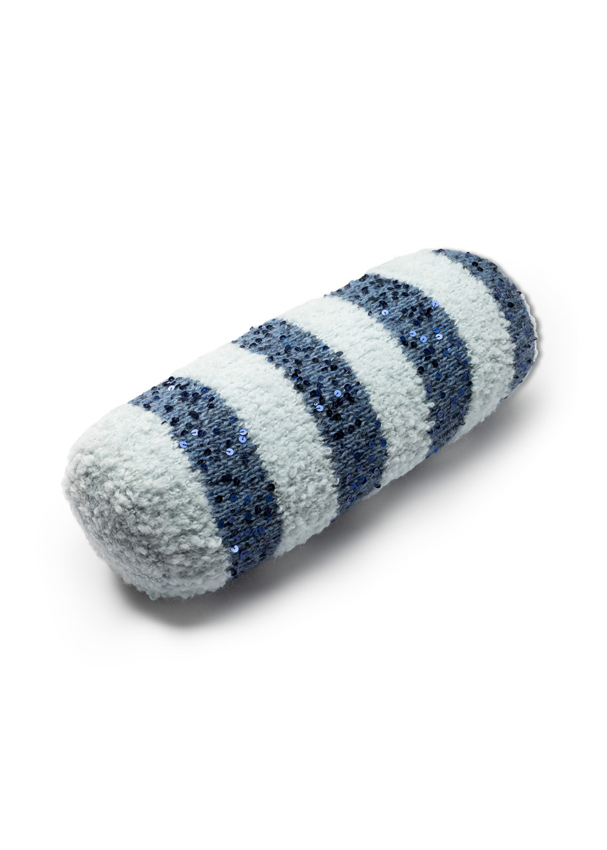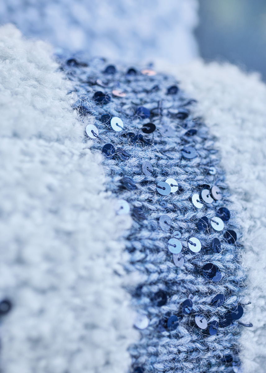 Lana Grossa-Qualität „Orsetto” (60 % Schurwolle (Merino), 40 % Alpaka (superfine), LL = ca. 75 m/50 g): ca. 100 g Weißblau (Fb. 1), Lana Grossa-Qualität „Brigitte No. 2” (47 % (Baby) Alpaka, 45 % Baumwolle, 8 % Schurwolle (Merino), LL = ca. 140 m/50 g): ca. 50 g Jeans (Fb. 6) und Lana Grossa-Qualität „Cosmo” (100 % Baumwolle (plus Pailletten), LL = ca. 260 m/100 g): ca. 100 g Nachtblau (Fb. 19); 1 Wollhäkelnadel Nr. 4, Stricknadeln Nr. 5; 1 Nackenrolle, 45 x 15 cm ø.